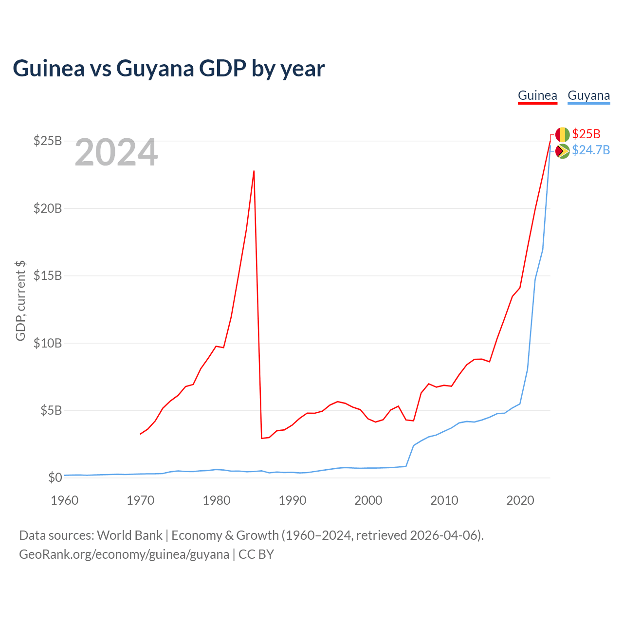 Guinea has a GDP of $25B compared to $24.7B for Guyana, ranking 118/197 and 120/197 by economy size, respectively.