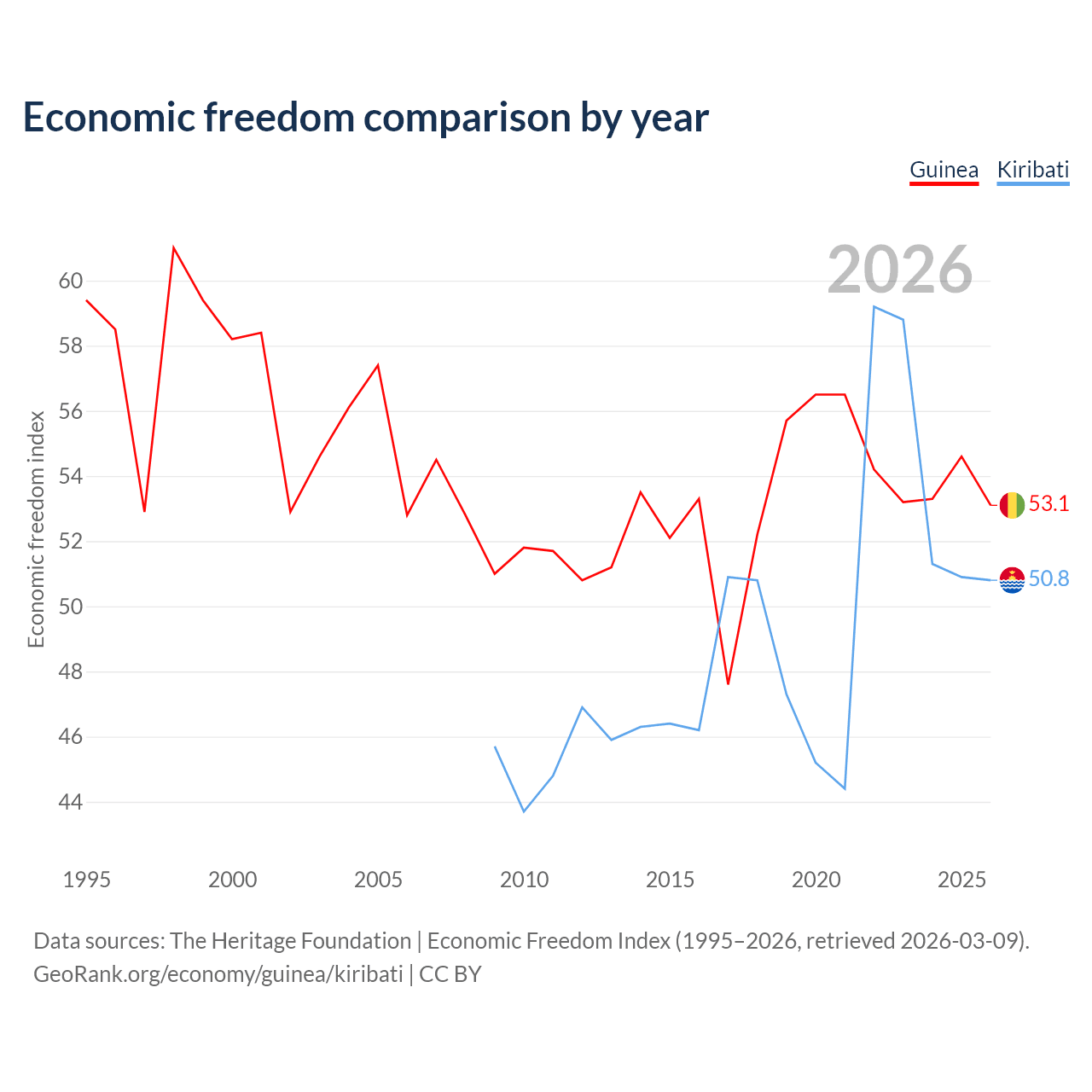 The Economic Freedom Index for Guinea is 53.1, ranking 141/197, compared to 50.8 for Kiribati, ranking 158/197. The chart above displays a comparison of annual changes in economic freedom indexes.