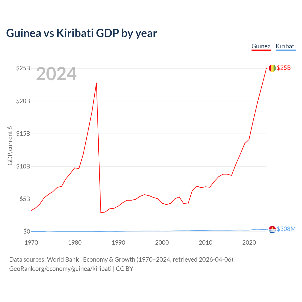 Guinea has a GDP of $25B compared to $308M for Kiribati, ranking 118/197 and 192/197 by economy size, respectively.