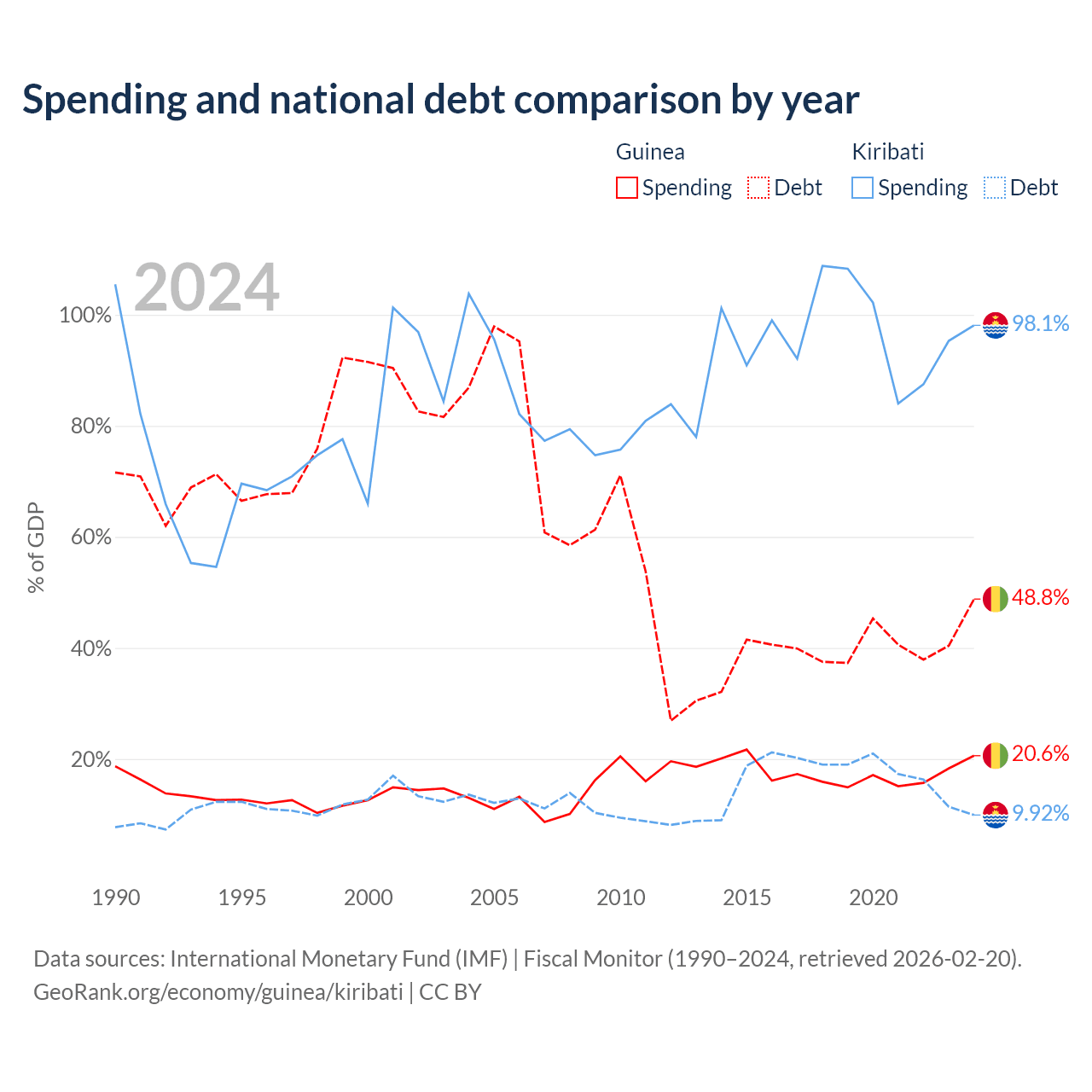 Guinea has $12.2B in government debt (48.8% of GDP), compared to $30.5M (9.92% of GDP) in Kiribati.