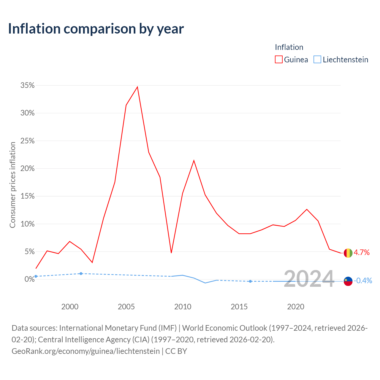 Over the past 24 years, Guinea has recorded an average annual inflation rate of 12.3%, compared with 0.04% in Liechtenstein. In 2020, inflation was 4.7% in Guinea and -0.4% in Liechtenstein.