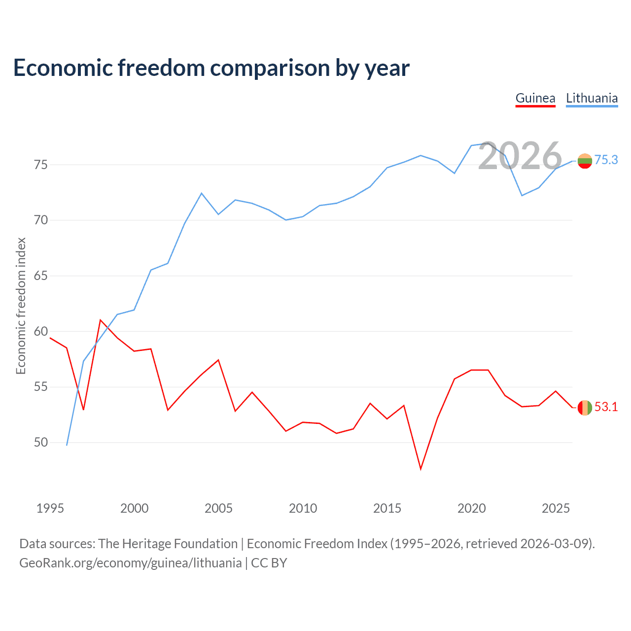The Economic Freedom Index for Guinea is 53.1, ranking 141/197, compared to 75.3 for Lithuania, ranking 18/197. The chart above displays a comparison of annual changes in economic freedom indexes.