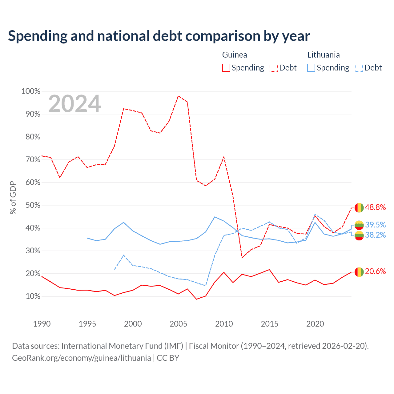 Guinea has $12.2B in government debt (48.8% of GDP), compared to $32.4B (38.2% of GDP) in Lithuania.