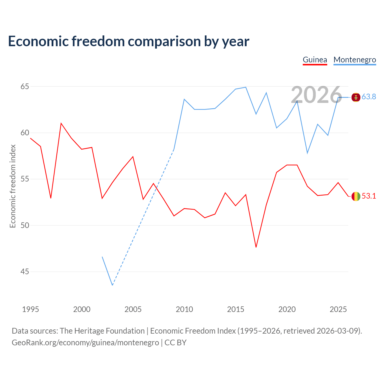 The Economic Freedom Index for Guinea is 53.1, ranking 141/197, compared to 63.8 for Montenegro, ranking 78/197. The chart above displays a comparison of annual changes in economic freedom indexes.