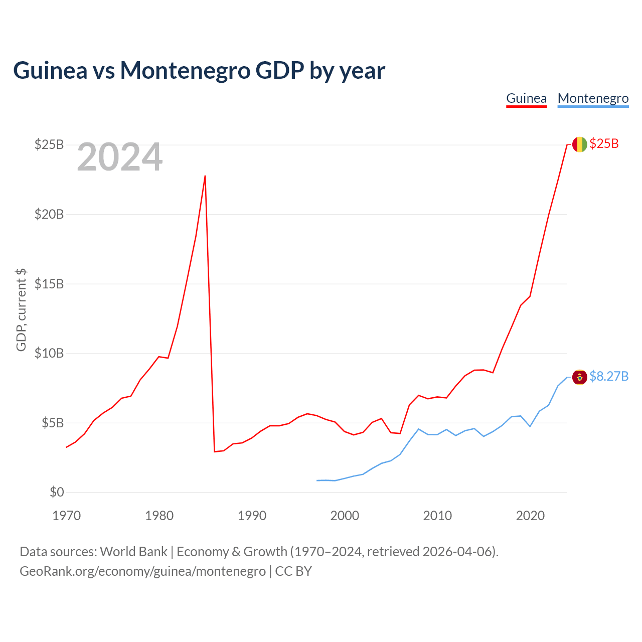 Guinea has a GDP of $25B compared to $8.27B for Montenegro, ranking 118/197 and 155/197 by economy size, respectively.
