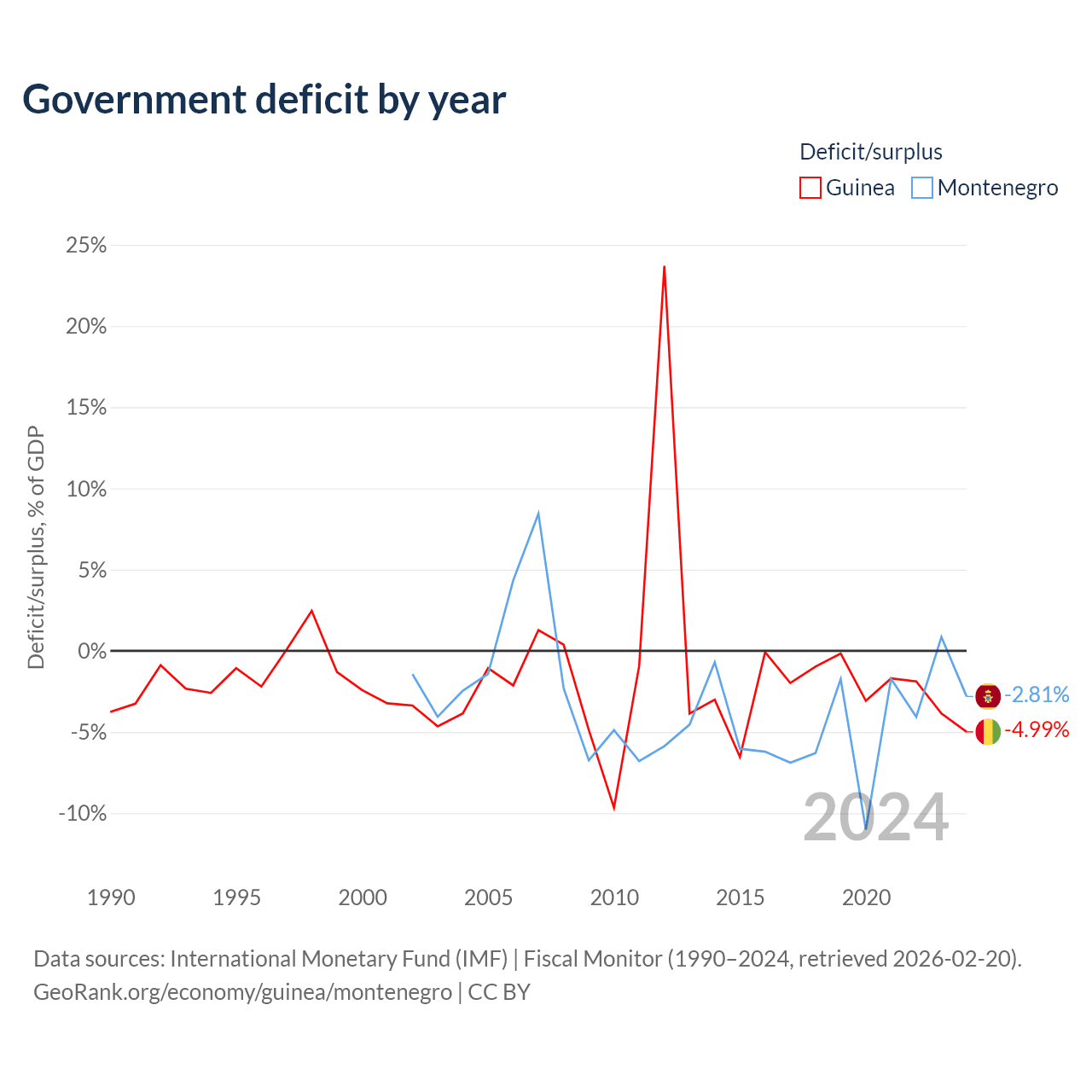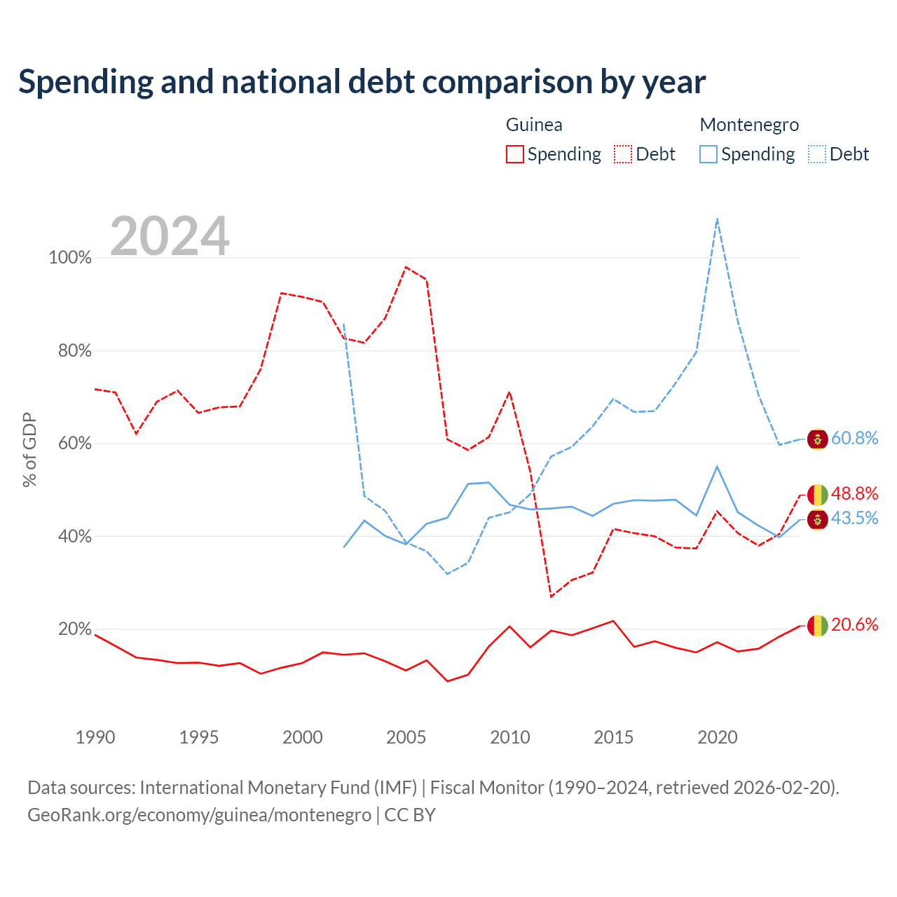 Guinea has $12.2B in government debt (48.8% of GDP), compared to $5.02B (60.8% of GDP) in Montenegro.