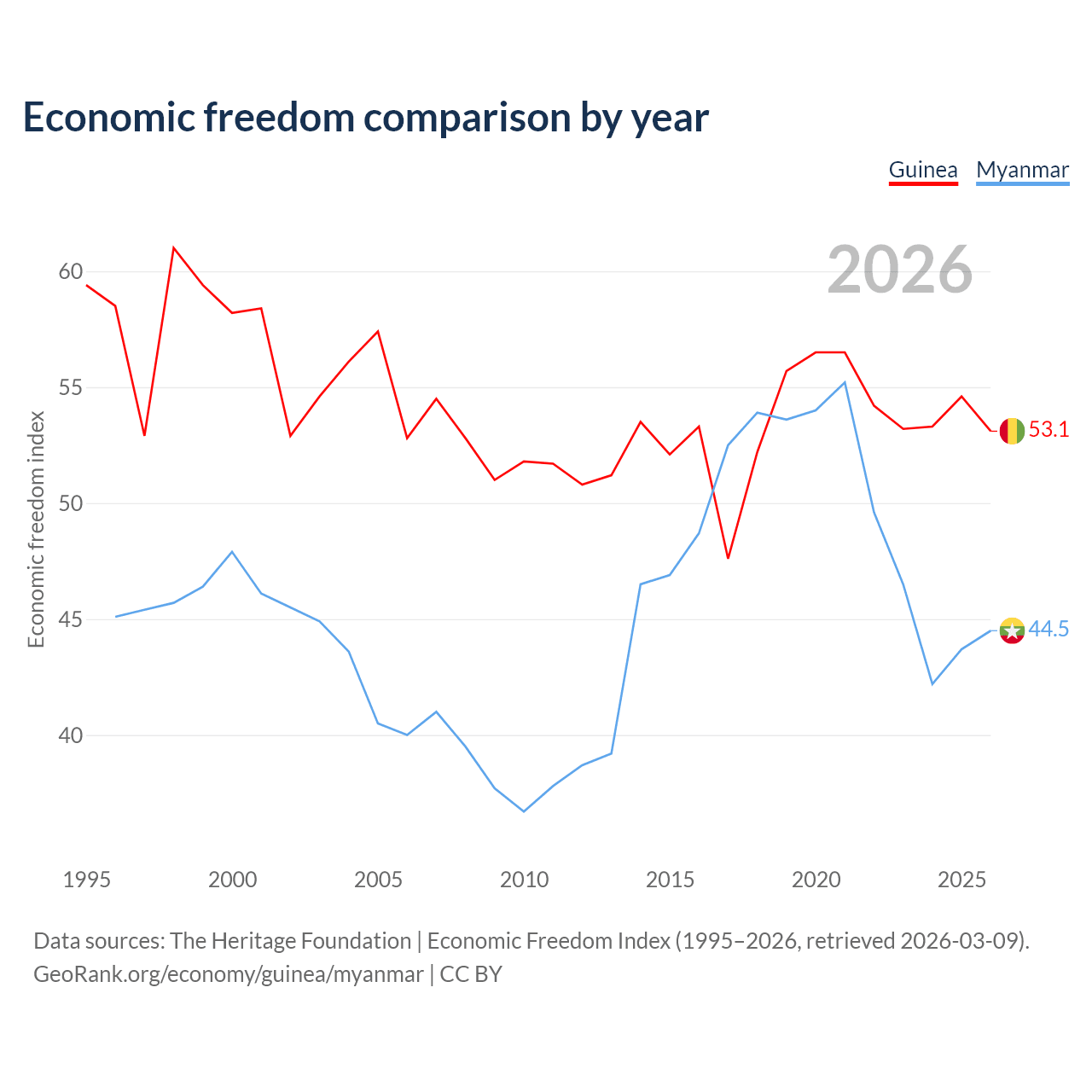 The Economic Freedom Index for Guinea is 53.1, ranking 141/197, compared to 44.5 for Myanmar, ranking 180/197. The chart above displays a comparison of annual changes in economic freedom indexes.