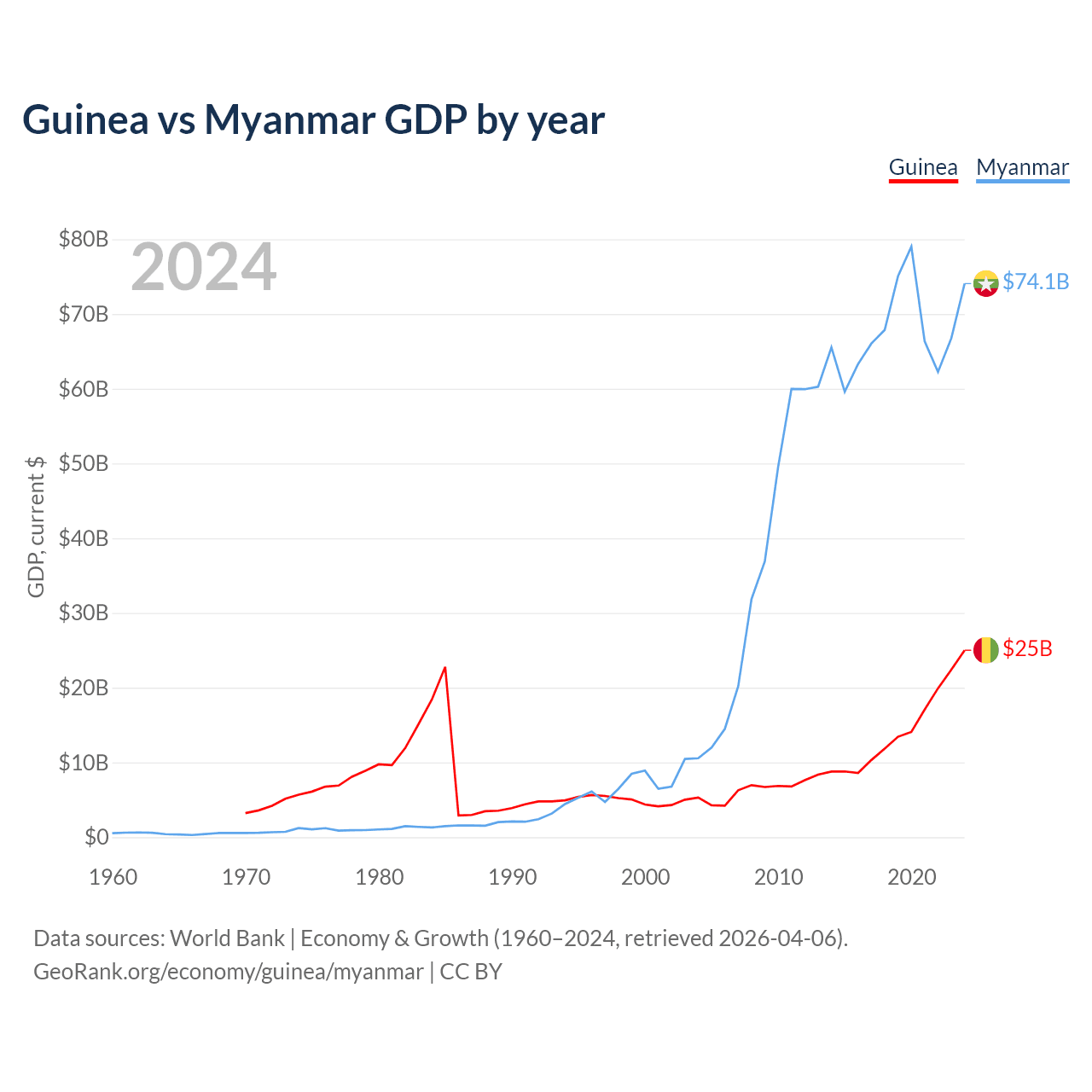 Guinea has a GDP of $25B compared to $74.1B for Myanmar, ranking 118/197 and 85/197 by economy size, respectively.