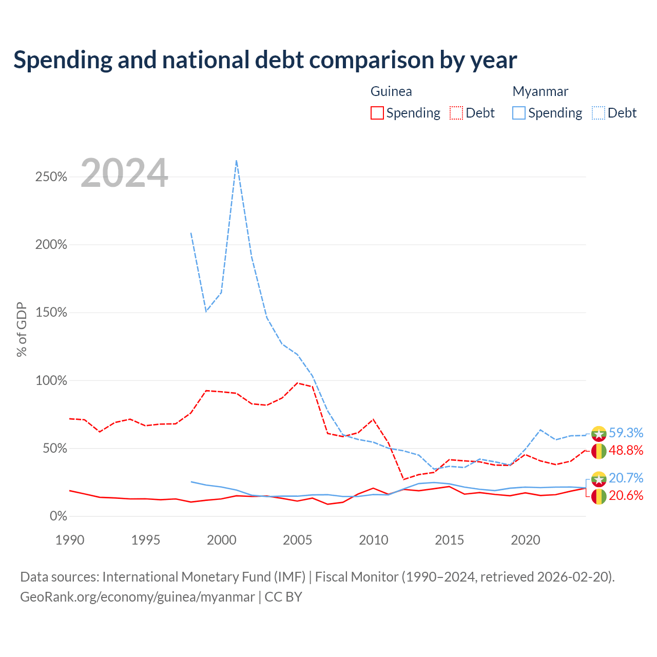 Guinea has $12.2B in government debt (48.8% of GDP), compared to $44B (59.3% of GDP) in Myanmar.
