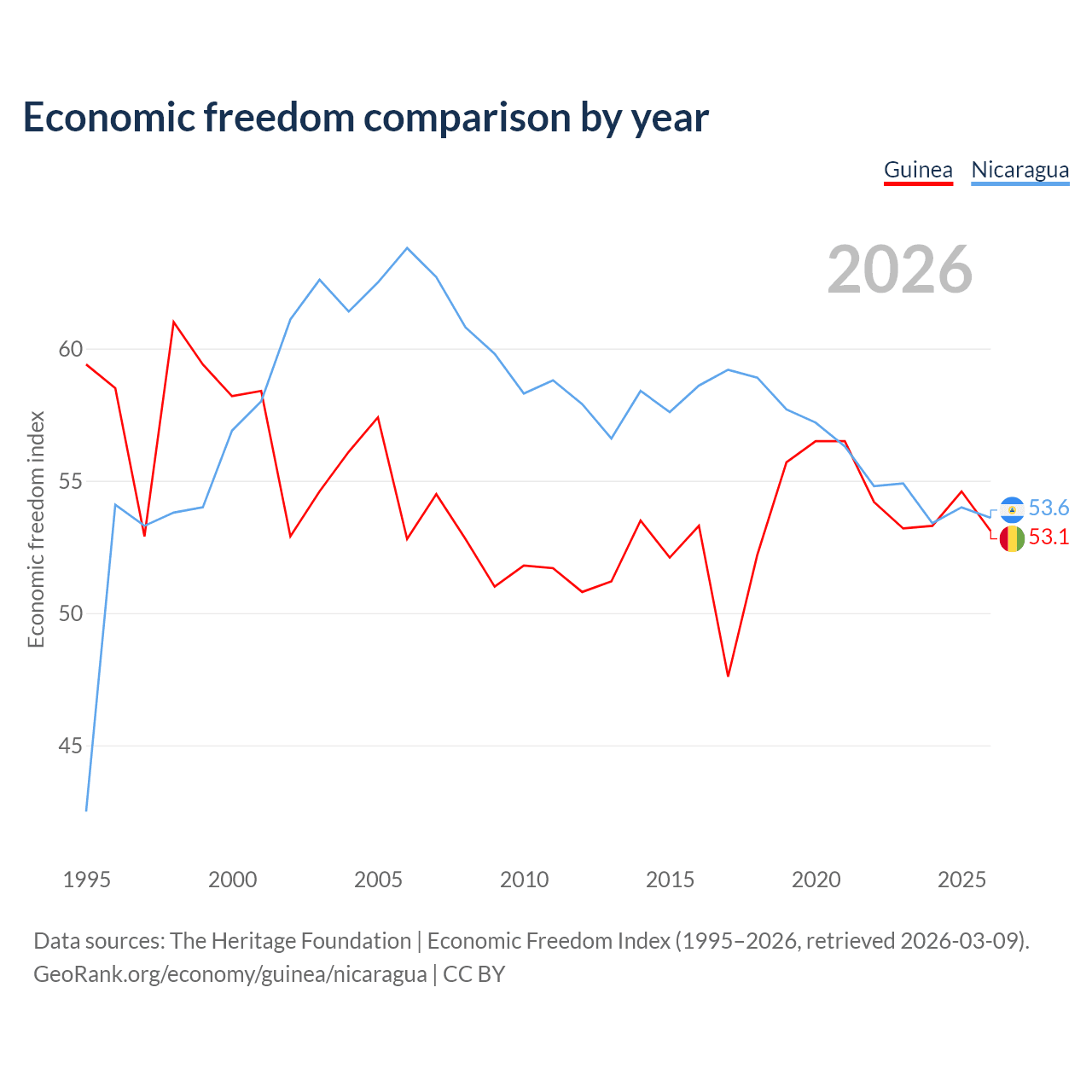 The Economic Freedom Index for Guinea is 53.1, ranking 141/197, compared to 53.6 for Nicaragua, ranking 139/197. The chart above displays a comparison of annual changes in economic freedom indexes.