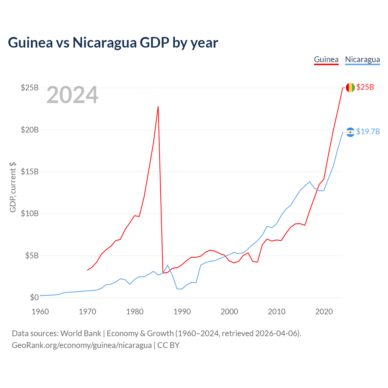 Guinea has a GDP of $25B compared to $19.7B for Nicaragua, ranking 118/197 and 131/197 by economy size, respectively.