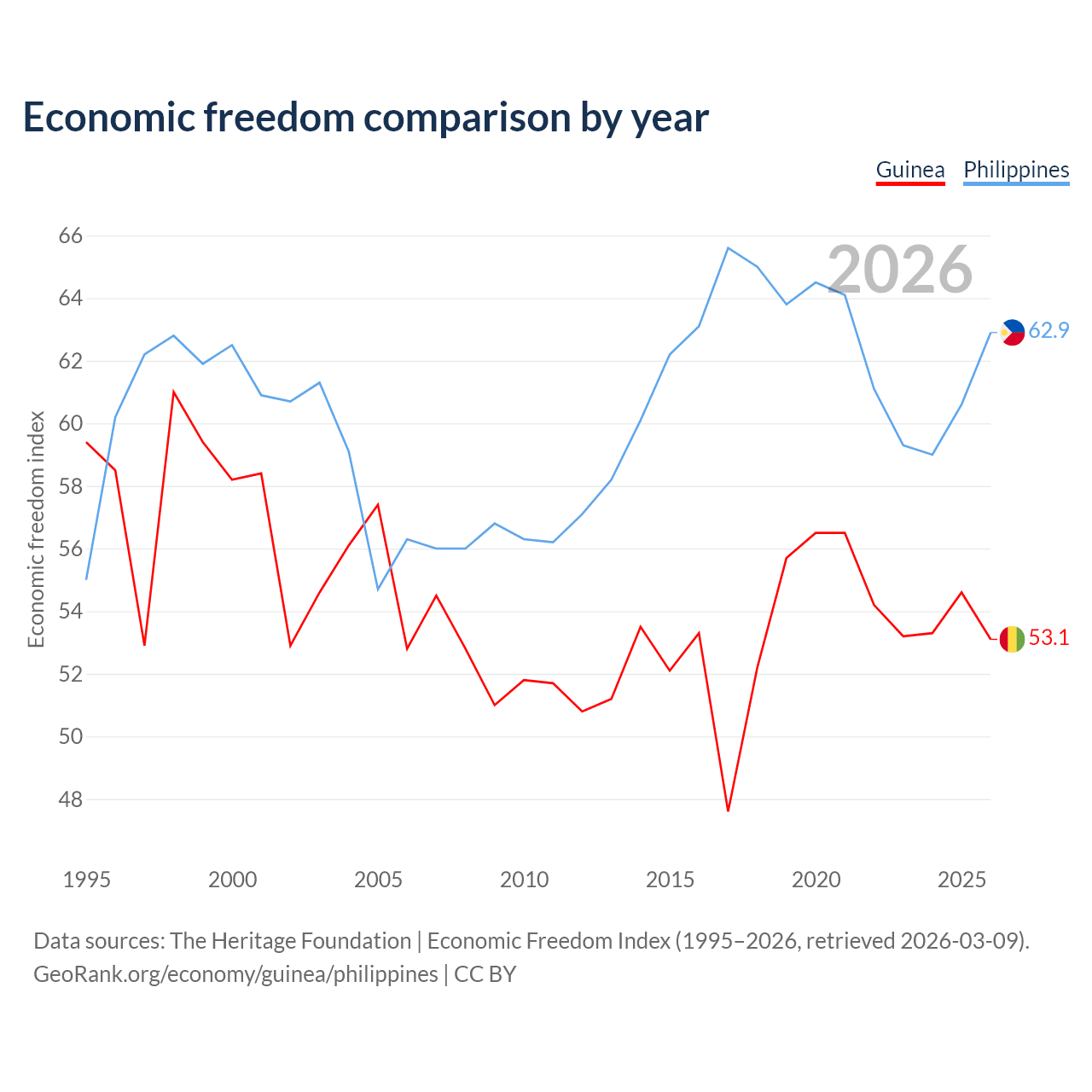 The Economic Freedom Index for Guinea is 53.1, ranking 141/197, compared to 62.9 for the Philippines, ranking 85/197. The chart above displays a comparison of annual changes in economic freedom indexes.