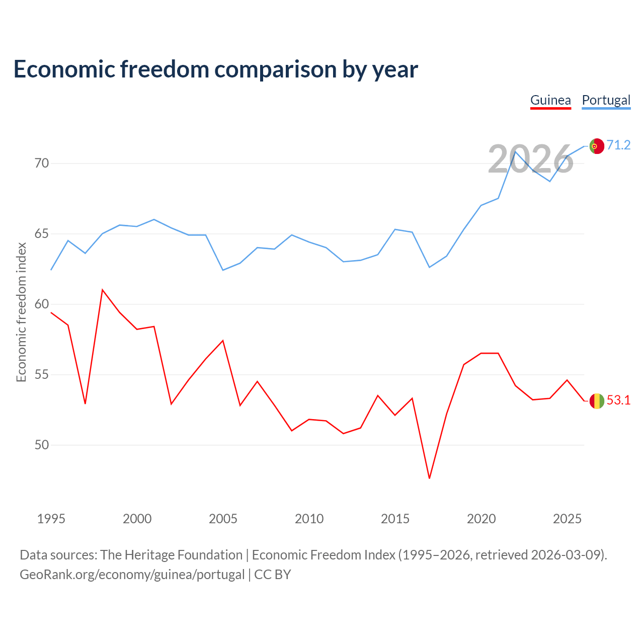 The Economic Freedom Index for Guinea is 53.1, ranking 141/197, compared to 71.2 for Portugal, ranking 33/197. The chart above displays a comparison of annual changes in economic freedom indexes.