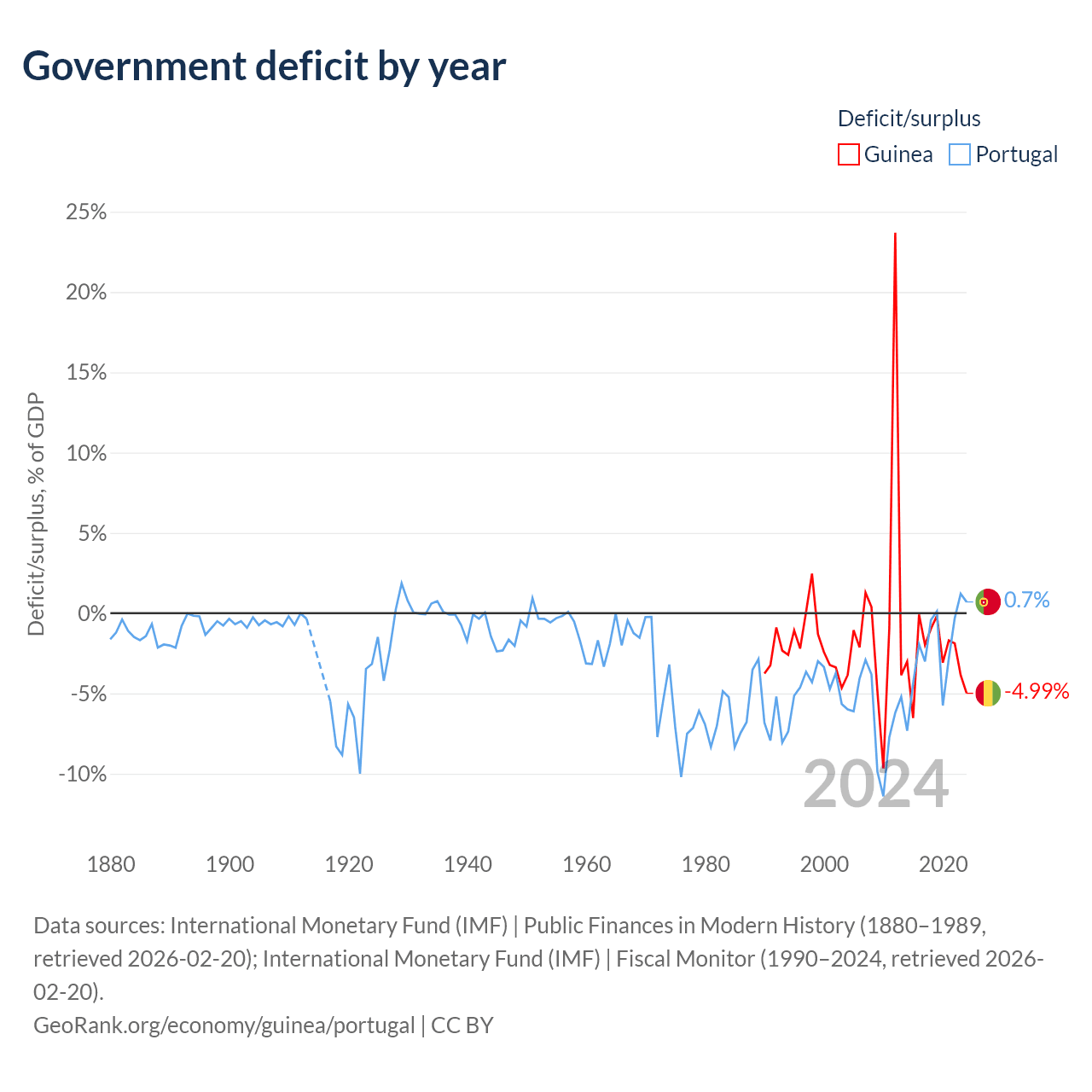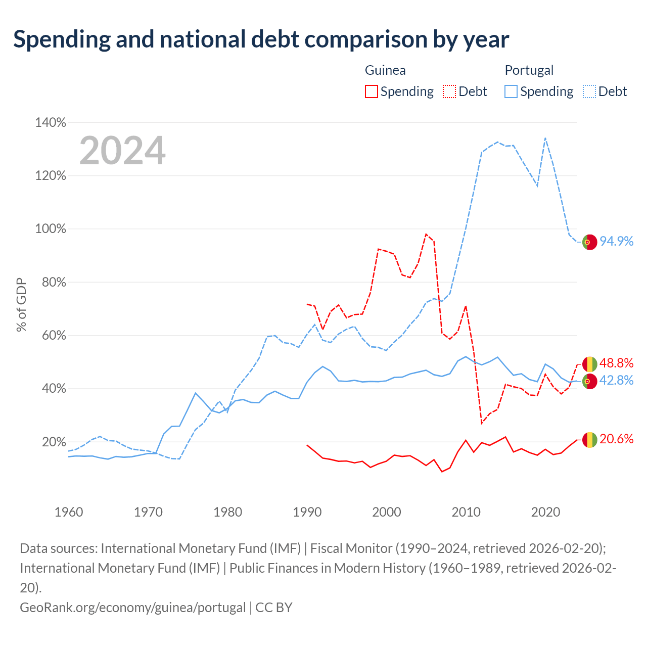 Guinea has $12.2B in government debt (48.8% of GDP), compared to $297B (94.9% of GDP) in Portugal.