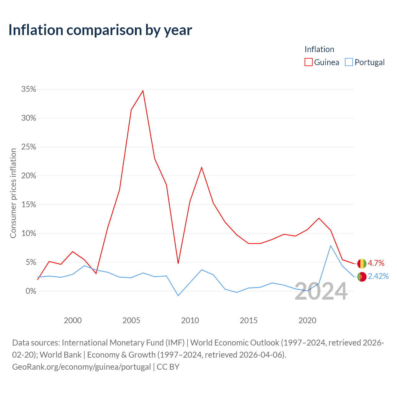 Guinea has a GDP of $25B compared to $313B for Portugal, ranking 118/197 and 46/197 by economy size, respectively.