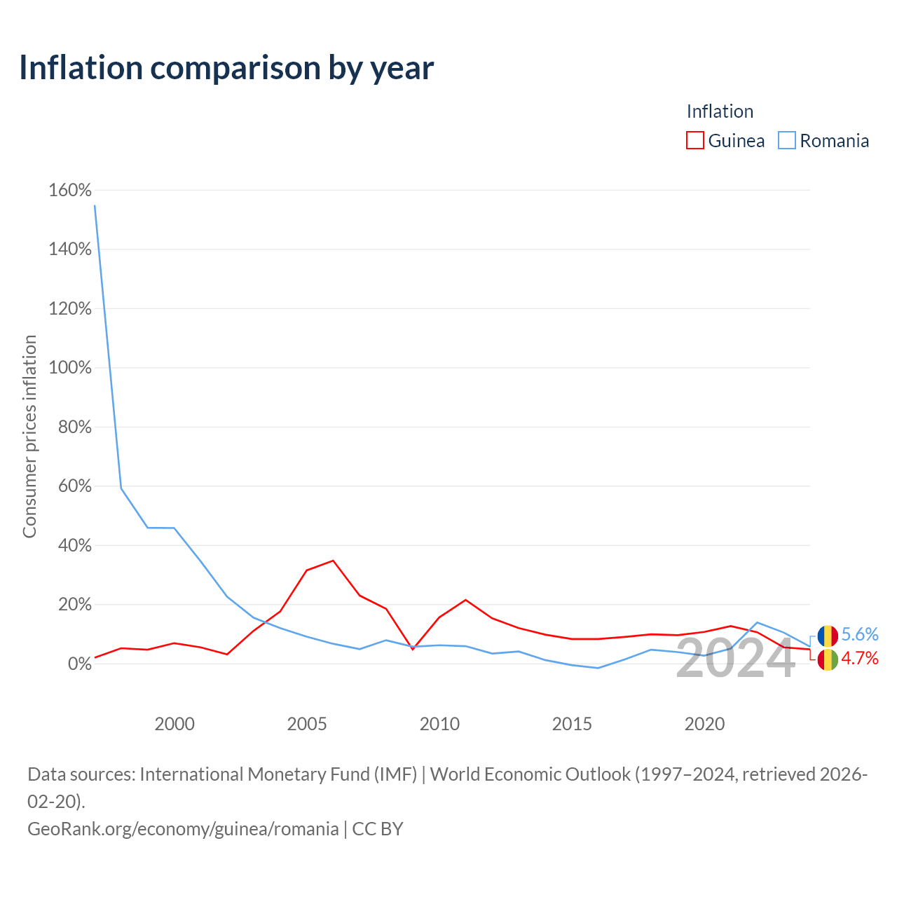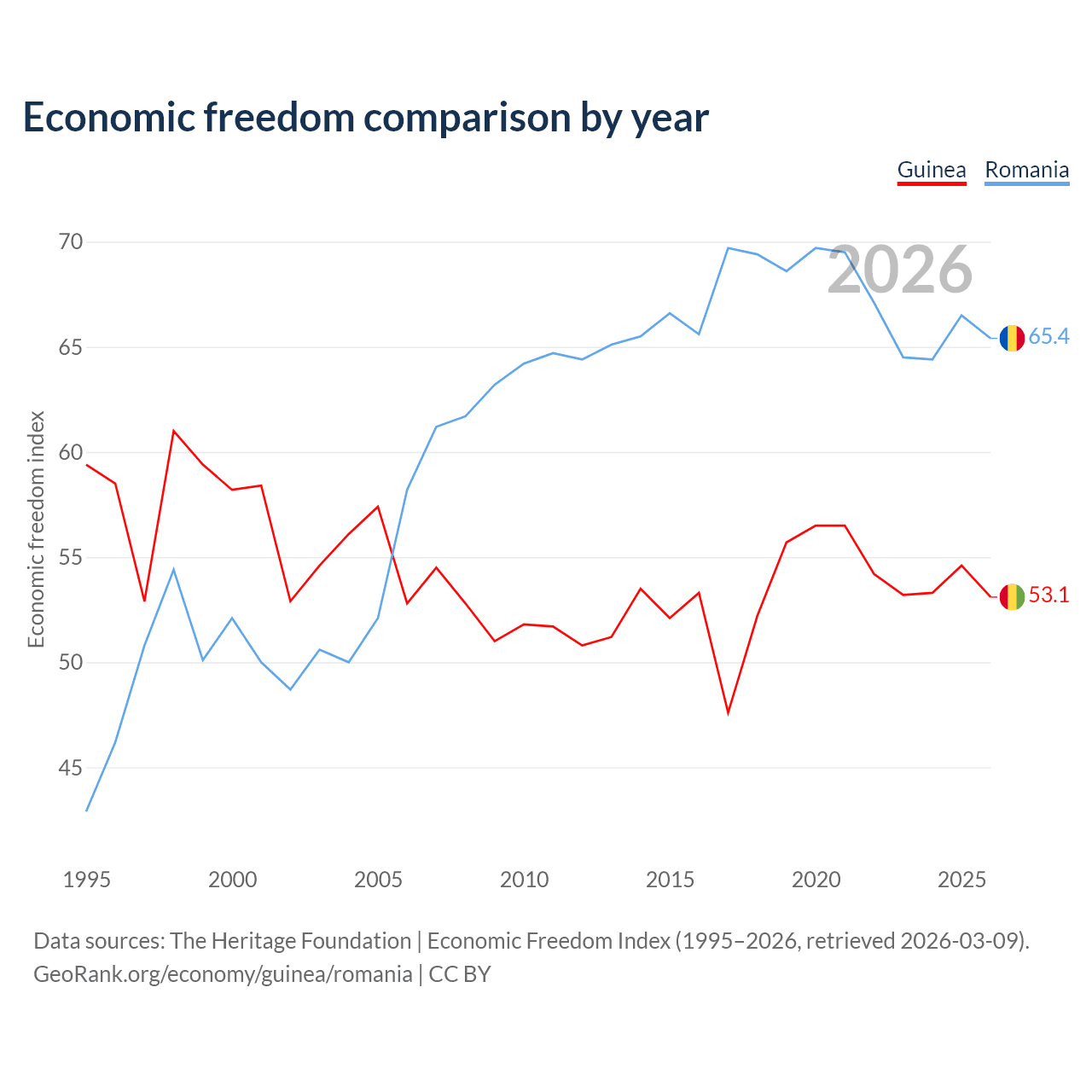 The Economic Freedom Index for Guinea is 53.1, ranking 141/197, compared to 65.4 for Romania, ranking 64/197. The chart above displays a comparison of annual changes in economic freedom indexes.