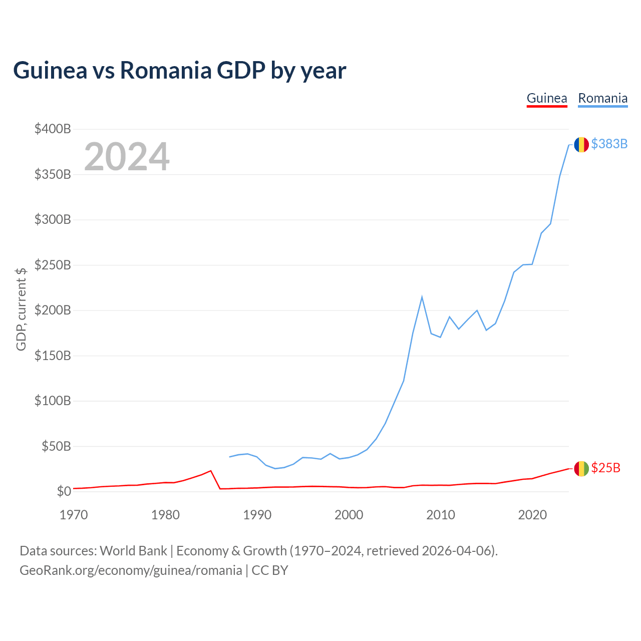 Guinea has a GDP of $25B compared to $383B for Romania, ranking 118/197 and 42/197 by economy size, respectively.