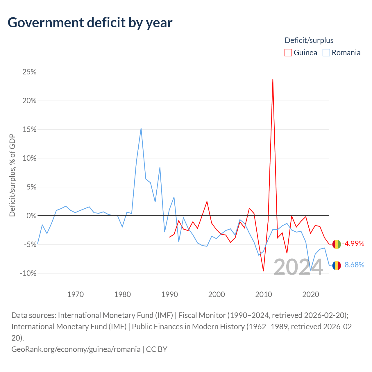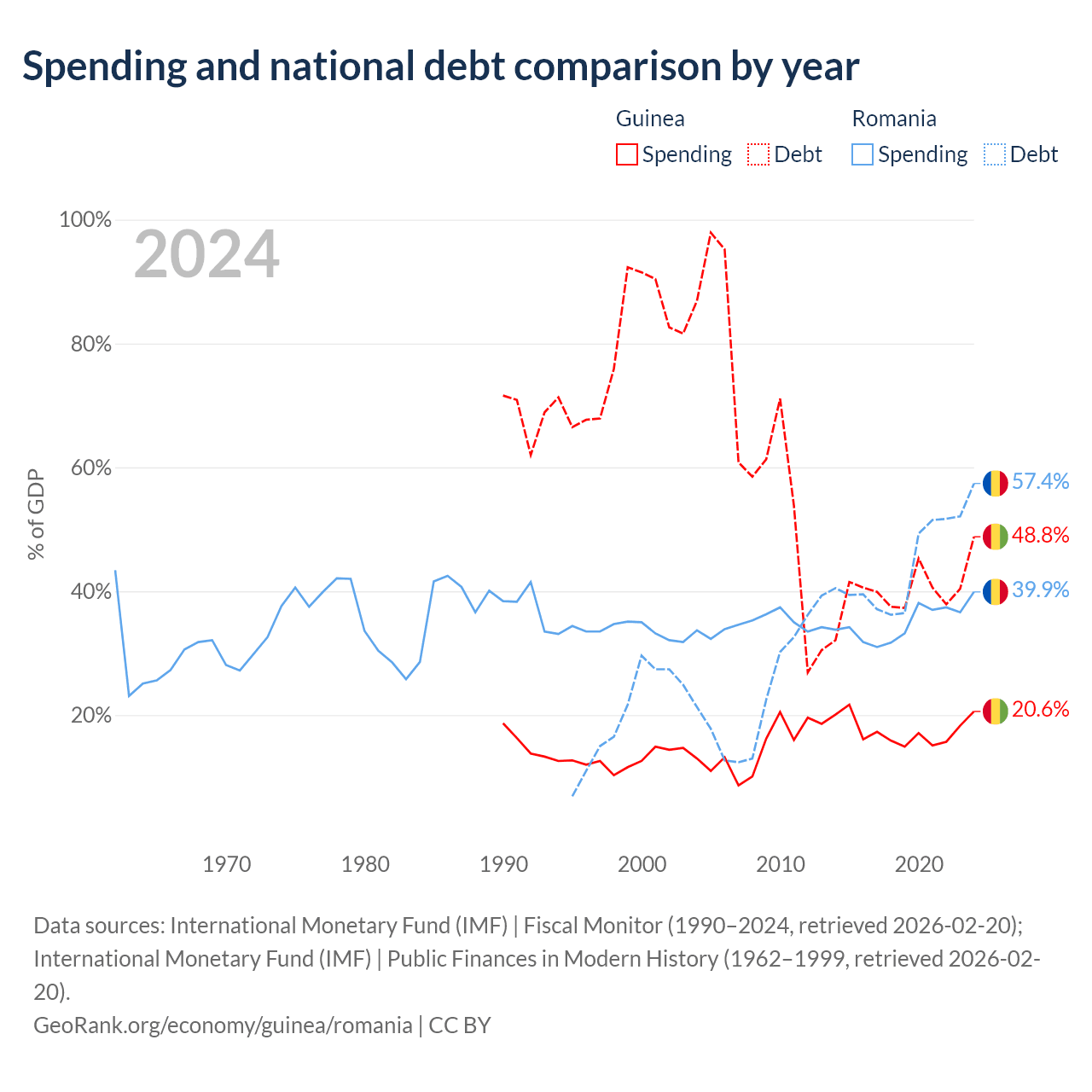 Guinea has $12.2B in government debt (48.8% of GDP), compared to $220B (57.4% of GDP) in Romania.