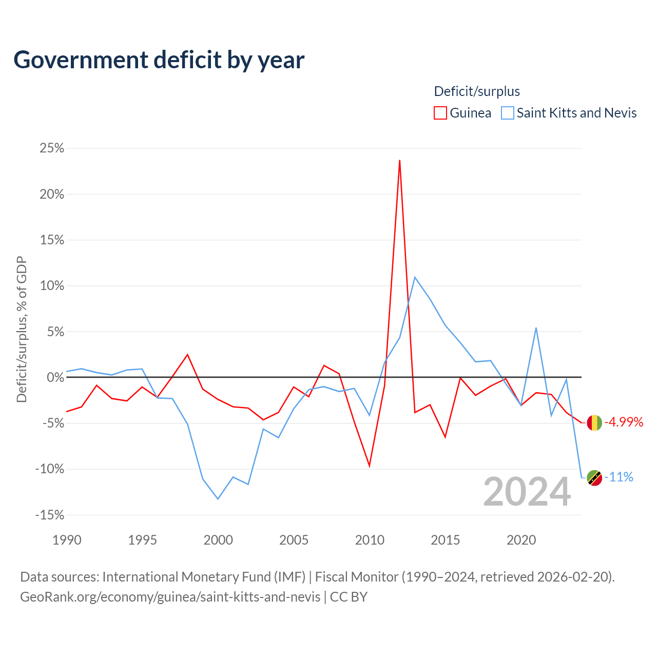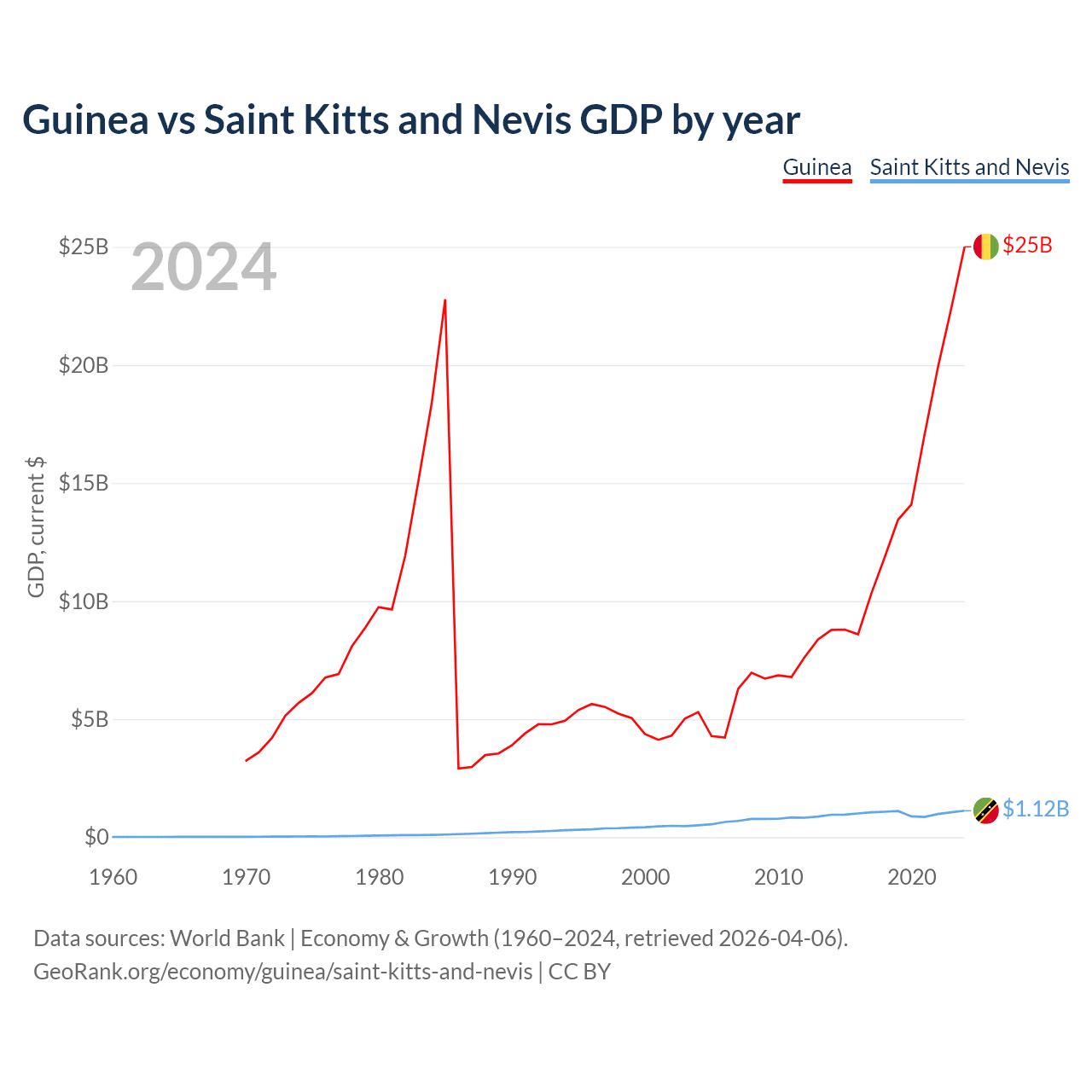 Guinea has a GDP of $25B compared to $1.12B for Saint Kitts and Nevis, ranking 118/197 and 187/197 by economy size, respectively.