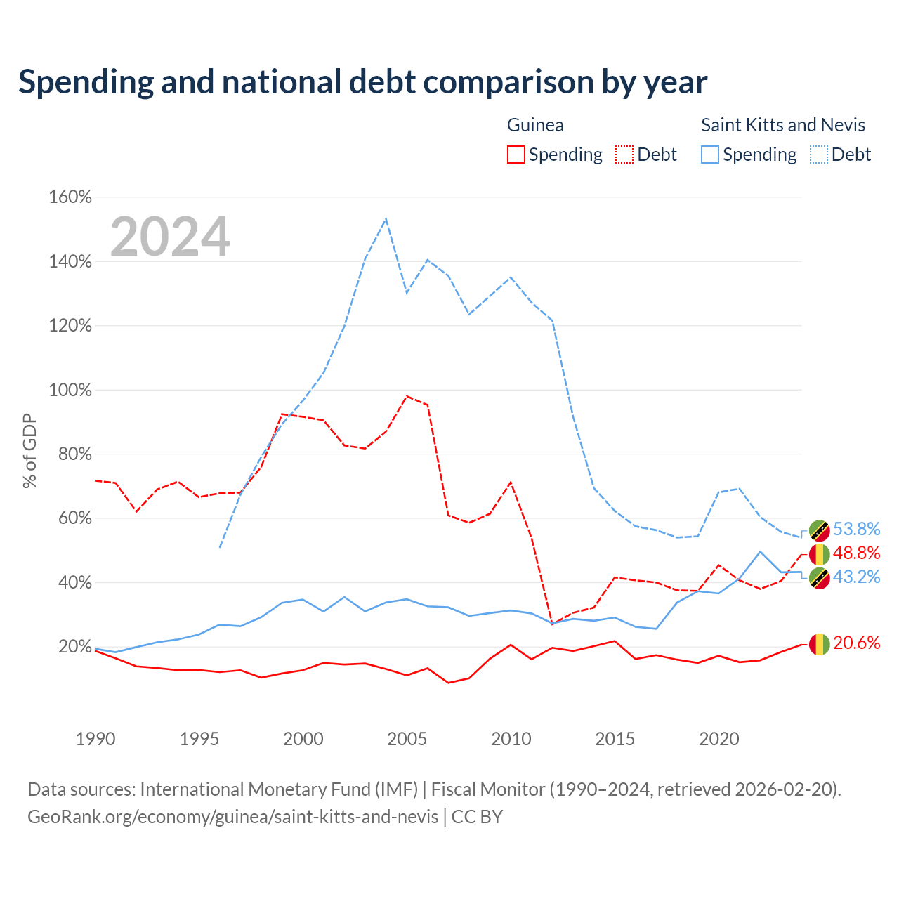 Guinea has $12.2B in government debt (48.8% of GDP), compared to $604M (53.8% of GDP) in Saint Kitts and Nevis.
