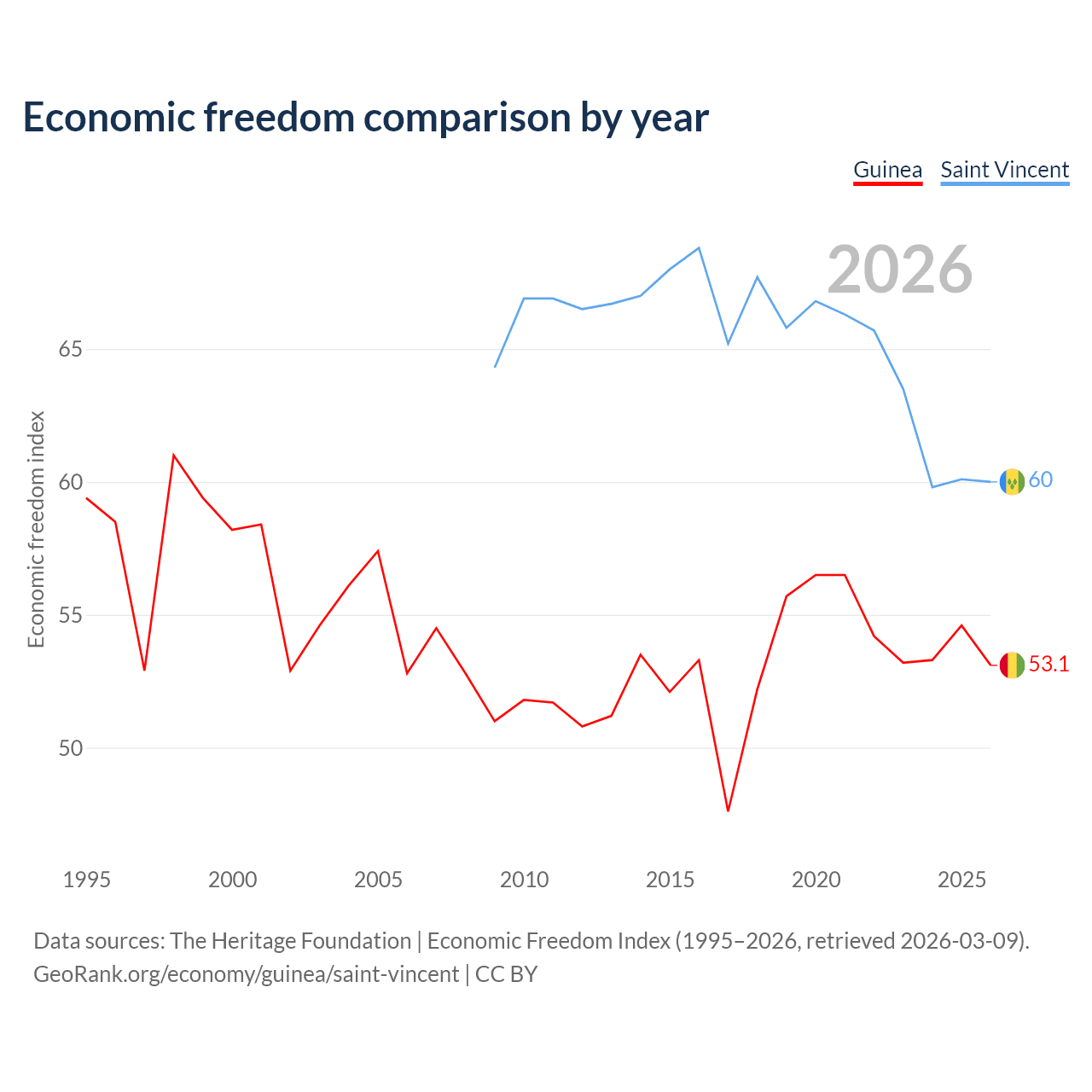 The Economic Freedom Index for Guinea is 53.1, ranking 141/197, compared to 60 for Saint Vincent, ranking 98/197. The chart above displays a comparison of annual changes in economic freedom indexes.