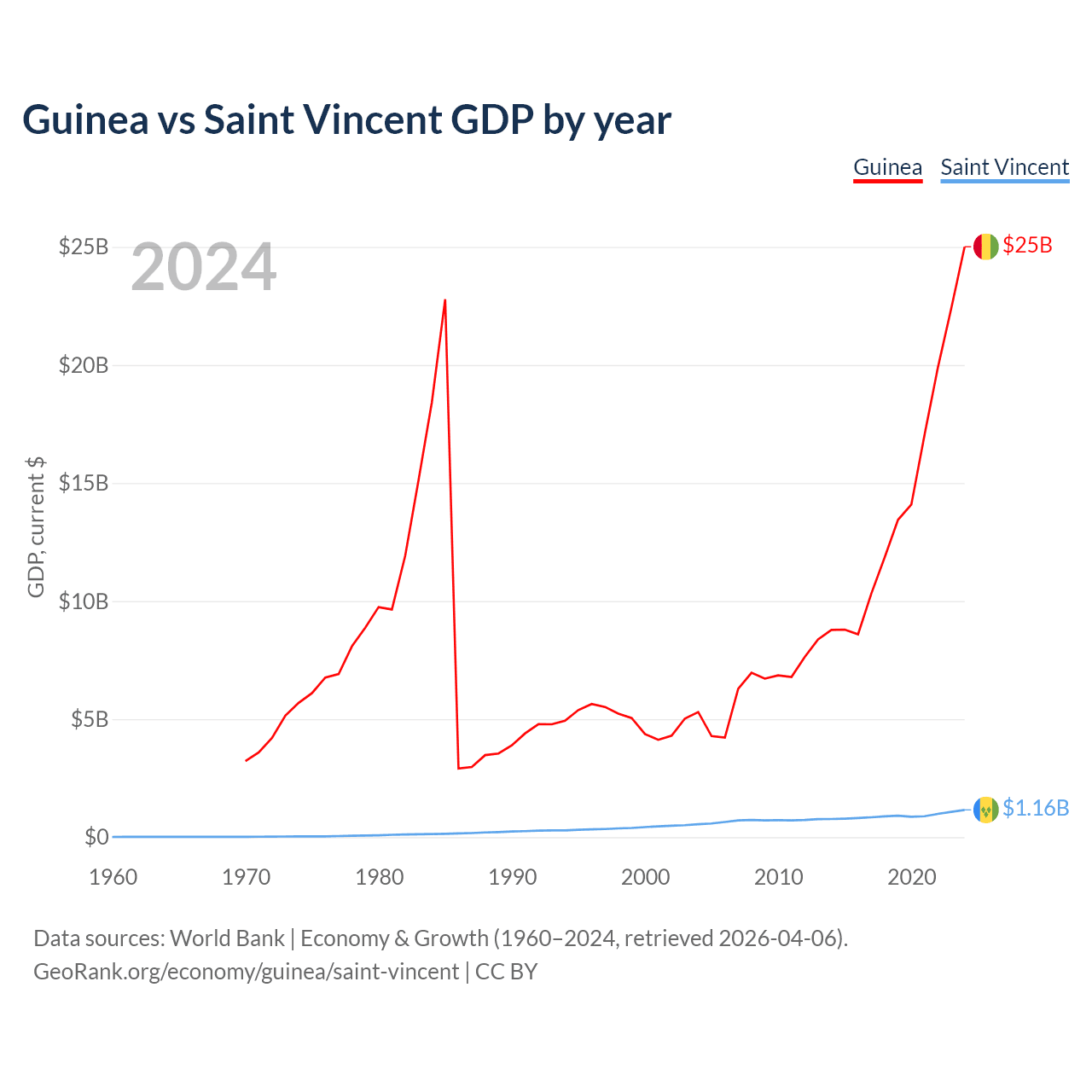 Guinea has a GDP of $25B compared to $1.16B for Saint Vincent, ranking 118/197 and 186/197 by economy size, respectively.