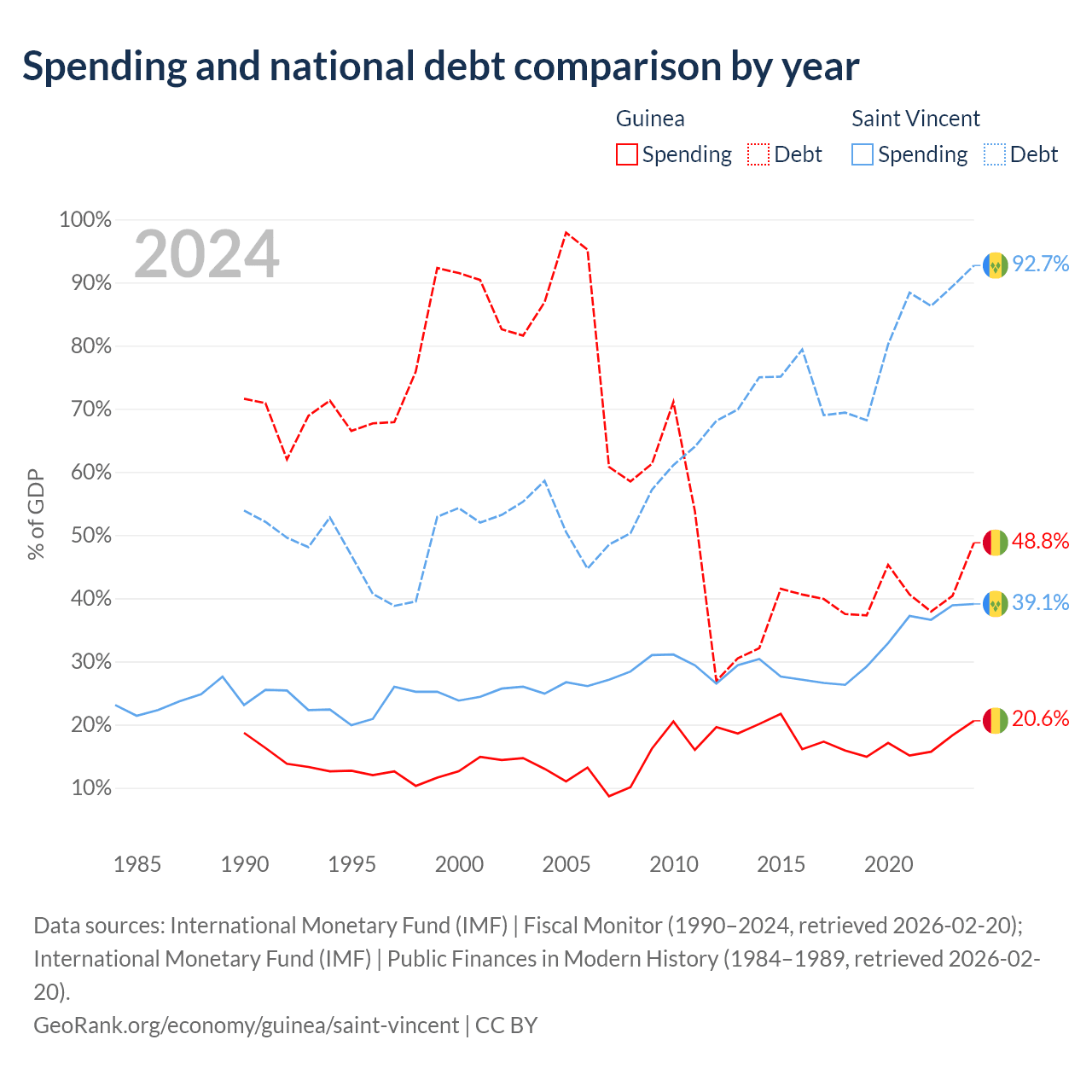 Guinea has $12.2B in government debt (48.8% of GDP), compared to $1.07B (92.7% of GDP) in Saint Vincent.