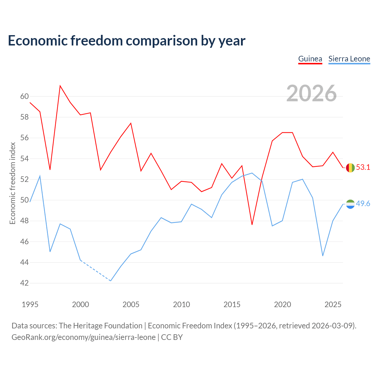 The Economic Freedom Index for Guinea is 53.1, ranking 141/197, compared to 49.6 for Sierra Leone, ranking 165/197. The chart above displays a comparison of annual changes in economic freedom indexes.