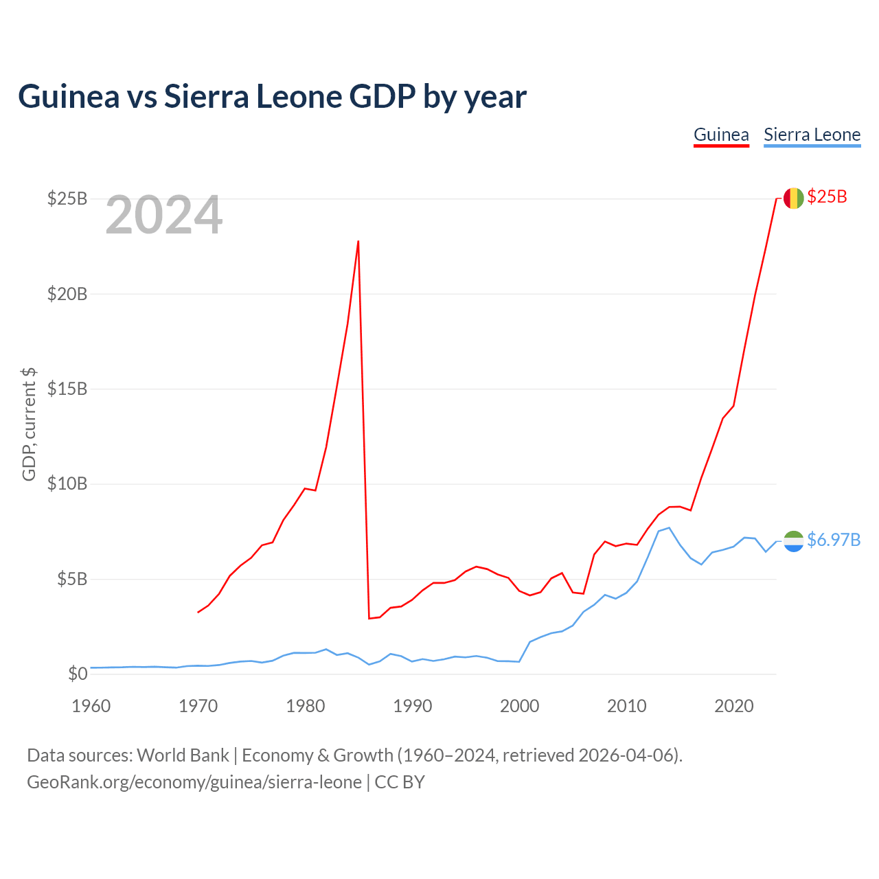 Guinea has a GDP of $25B compared to $6.97B for Sierra Leone, ranking 118/197 and 160/197 by economy size, respectively.