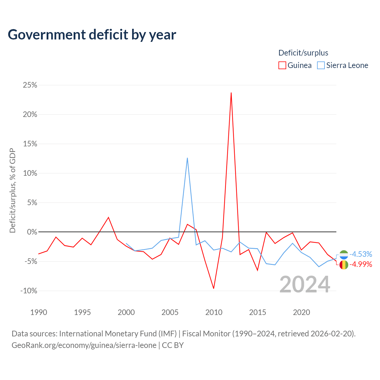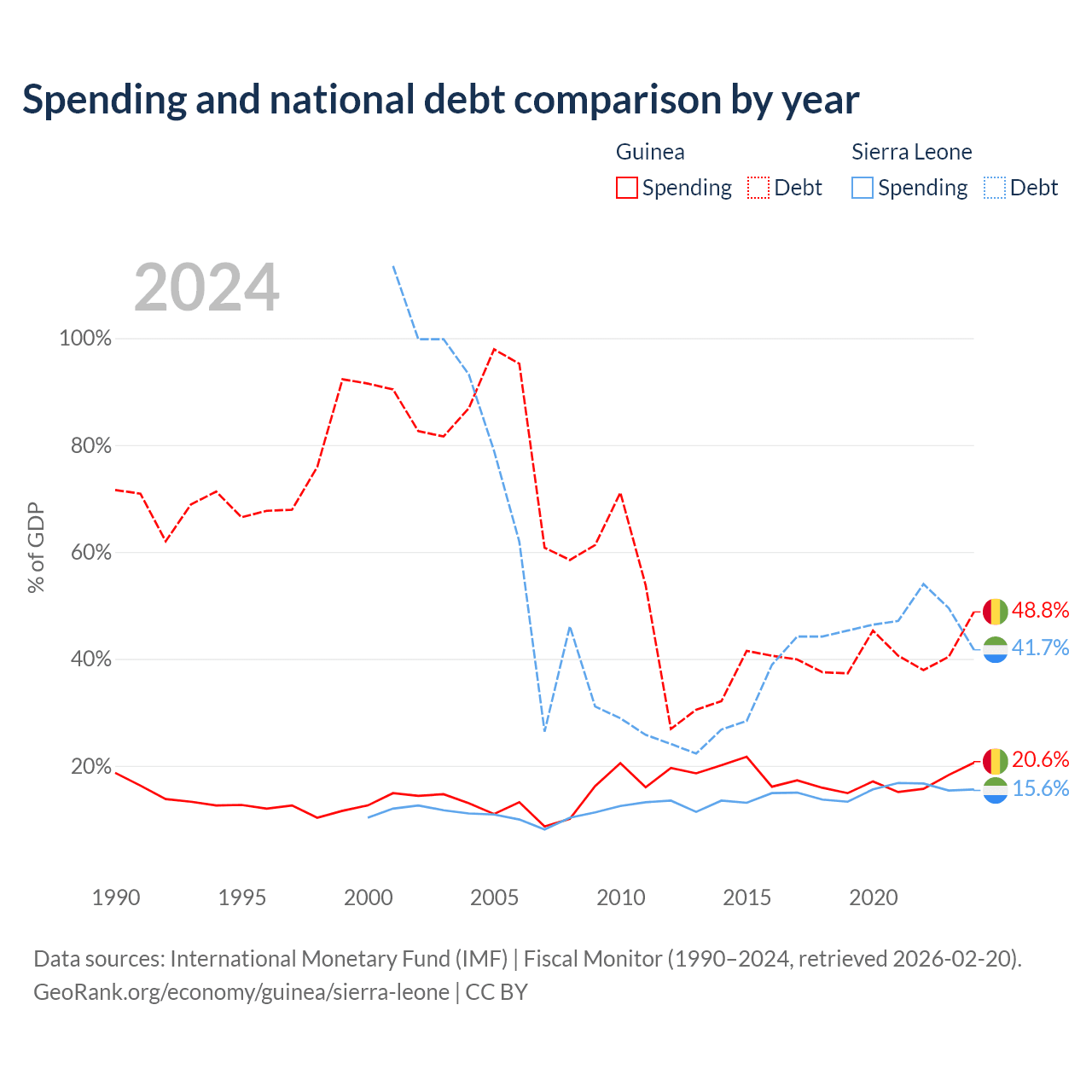 Guinea has $12.2B in government debt (48.8% of GDP), compared to $2.91B (41.7% of GDP) in Sierra Leone.