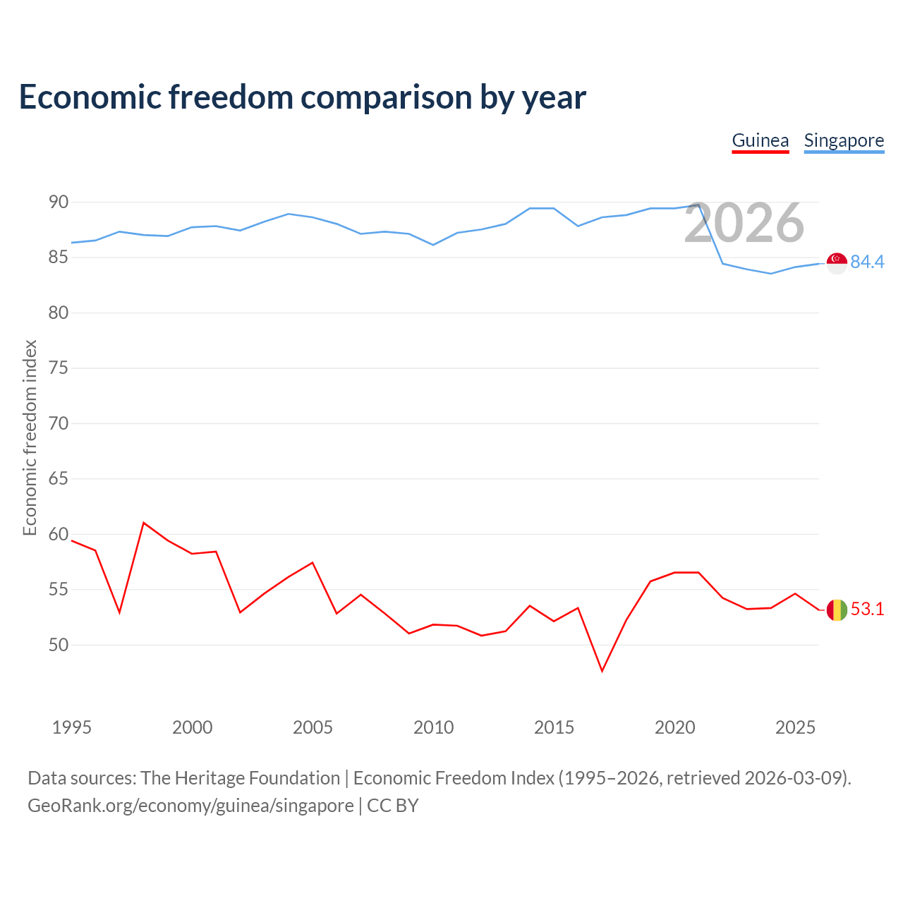 The Economic Freedom Index for Guinea is 53.1, ranking 141/197, compared to 84.4 for Singapore, ranking 1/197. The chart above displays a comparison of annual changes in economic freedom indexes.