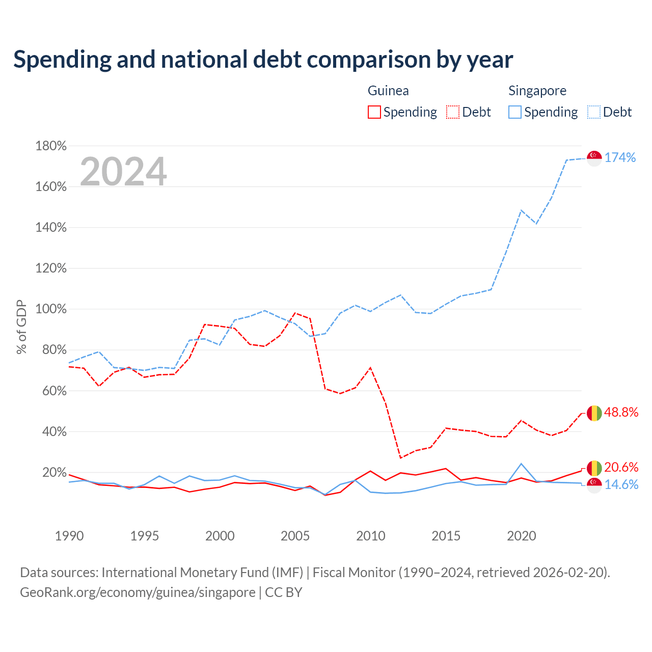 Guinea has $12.2B in government debt (48.8% of GDP), compared to $950B (173.5% of GDP) in Singapore.