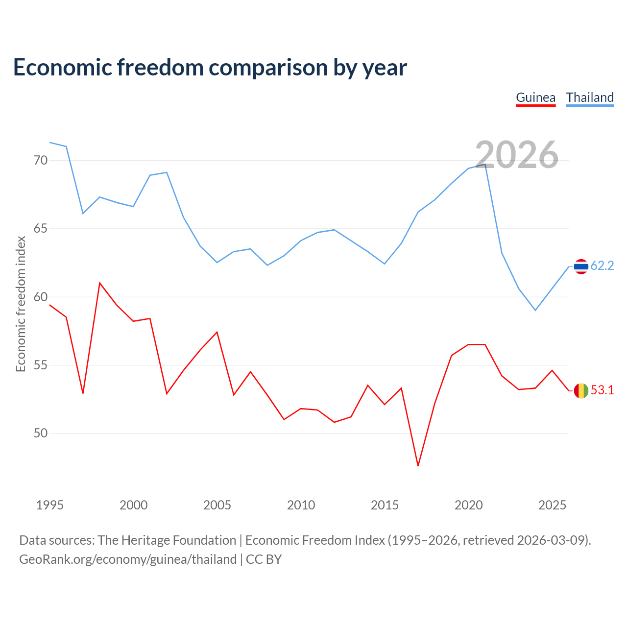 The Economic Freedom Index for Guinea is 53.1, ranking 141/197, compared to 62.2 for Thailand, ranking 88/197. The chart above displays a comparison of annual changes in economic freedom indexes.