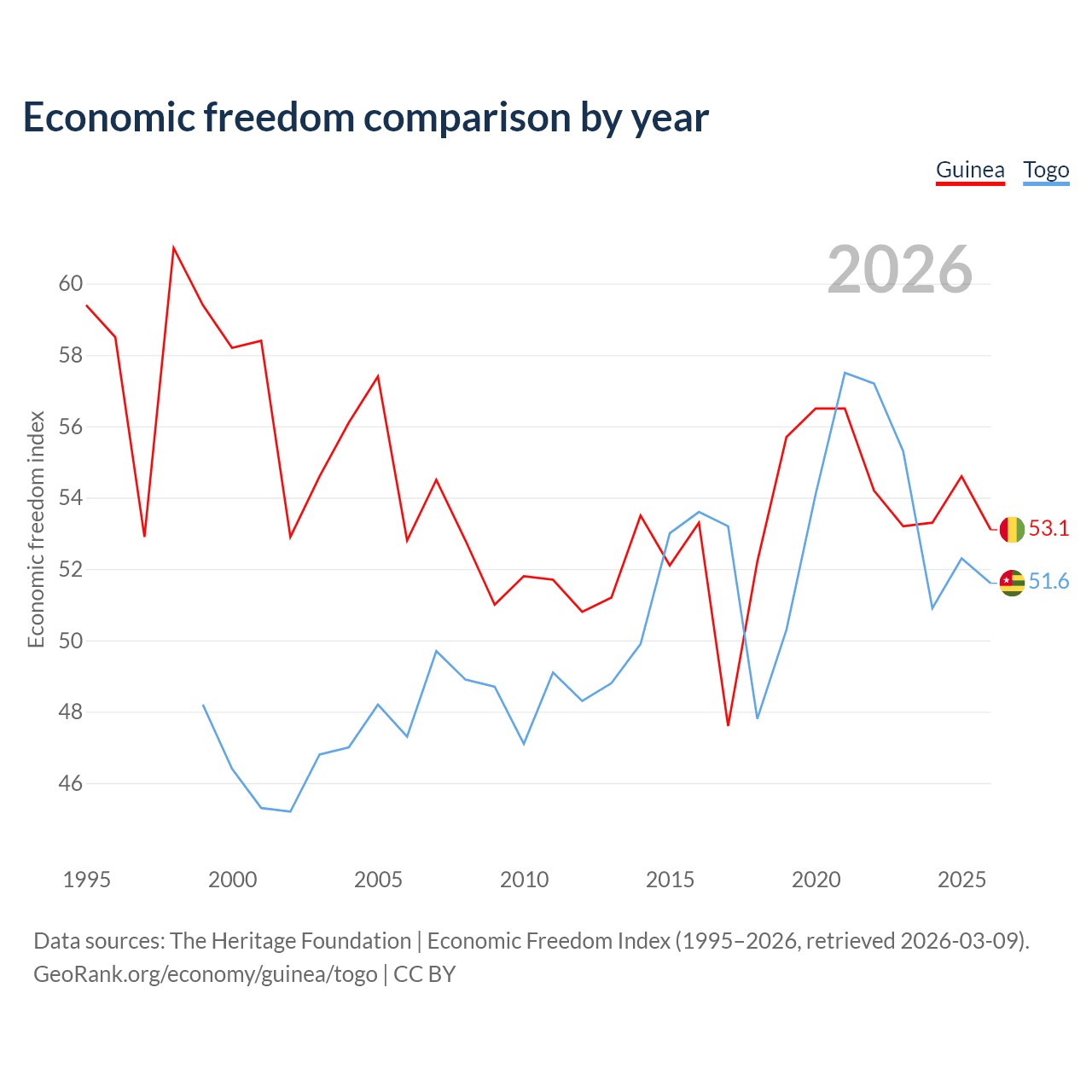 The Economic Freedom Index for Guinea is 53.1, ranking 141/197, compared to 51.6 for Togo, ranking 153/197. The chart above displays a comparison of annual changes in economic freedom indexes.