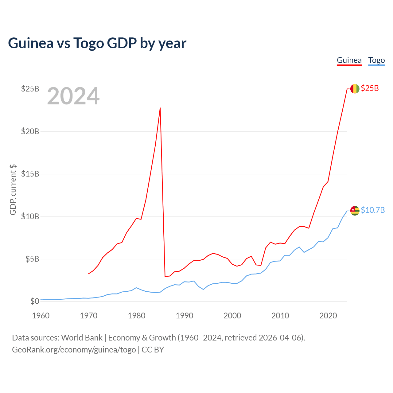 Guinea has a GDP of $25B compared to $10.7B for Togo, ranking 118/197 and 154/197 by economy size, respectively.