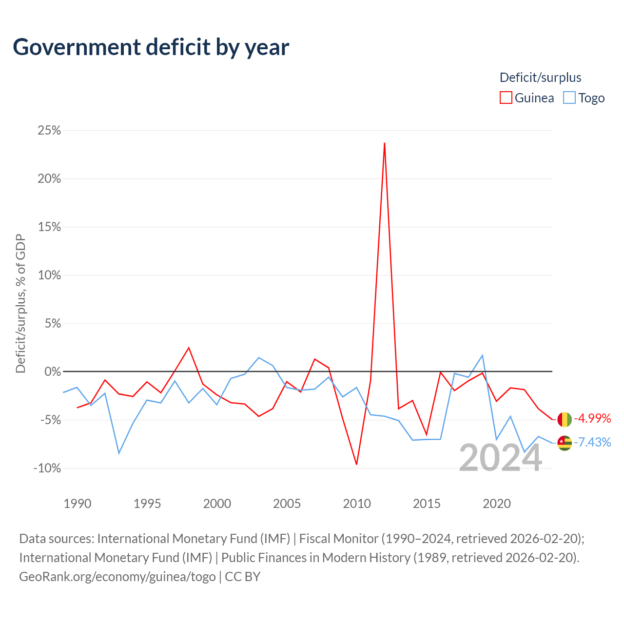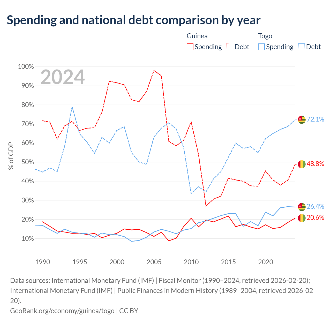 Guinea has $12.2B in government debt (48.8% of GDP), compared to $7.68B (72.1% of GDP) in Togo.