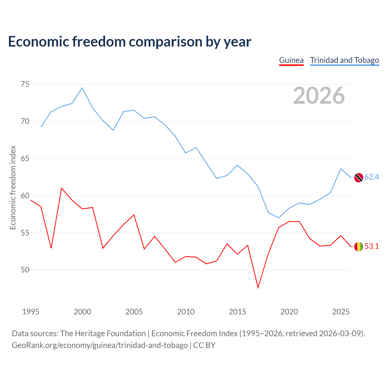 The Economic Freedom Index for Guinea is 53.1, ranking 141/197, compared to 62.4 for Trinidad and Tobago, ranking 87/197. The chart above displays a comparison of annual changes in economic freedom indexes.