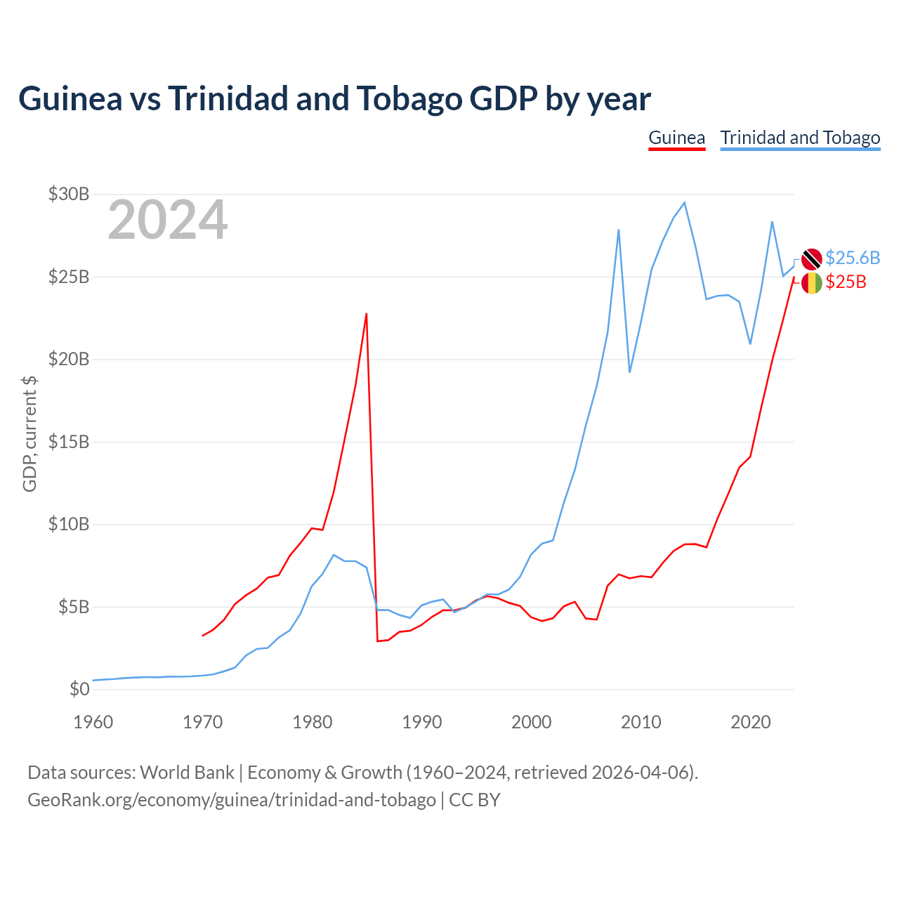 Guinea has a GDP of $25B compared to $25.6B for Trinidad and Tobago, ranking 118/197 and 115/197 by economy size, respectively.