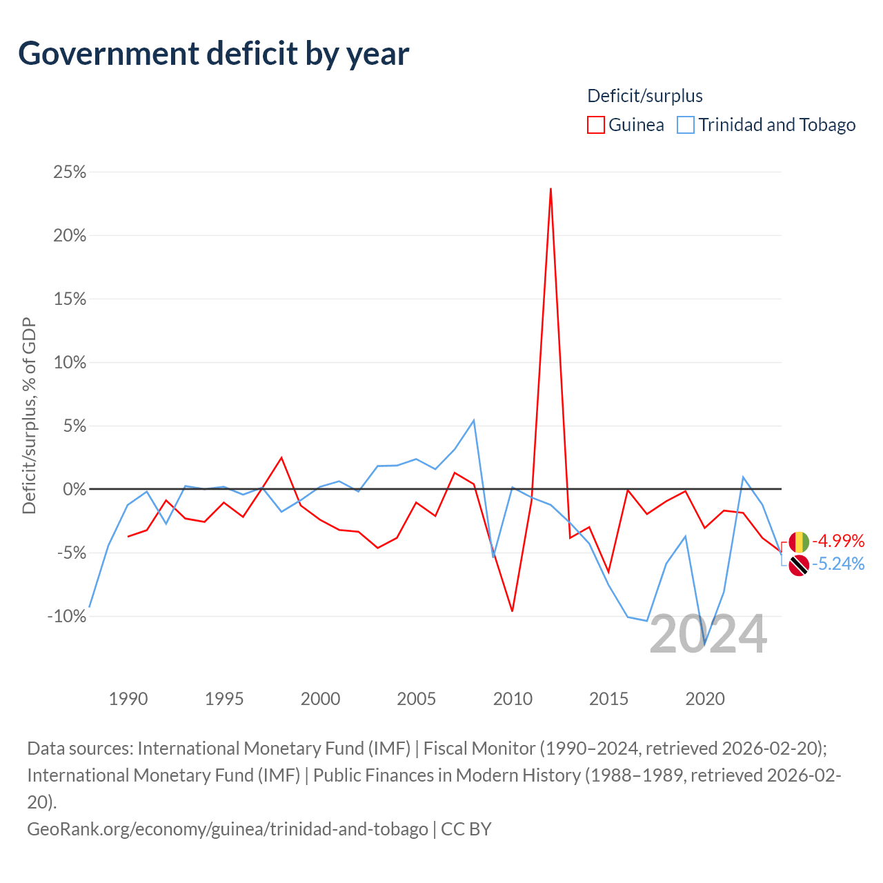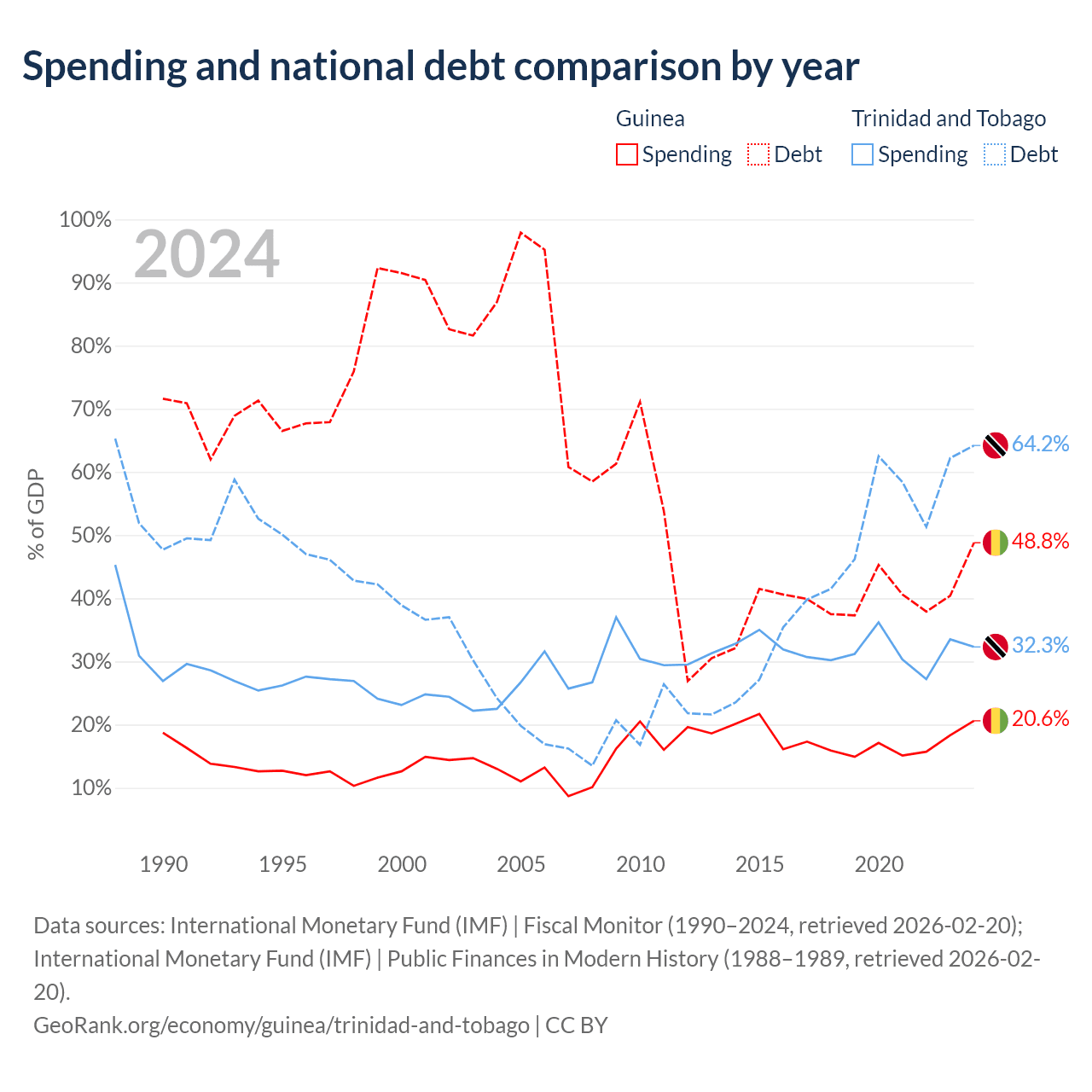 Guinea has $12.2B in government debt (48.8% of GDP), compared to $16.5B (64.2% of GDP) in Trinidad and Tobago.