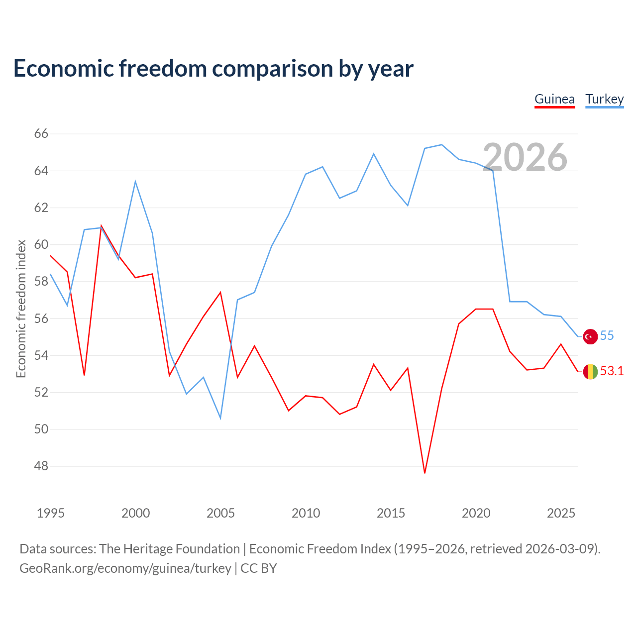 The Economic Freedom Index for Guinea is 53.1, ranking 141/197, compared to 55 for Turkey, ranking 129/197. The chart above displays a comparison of annual changes in economic freedom indexes.