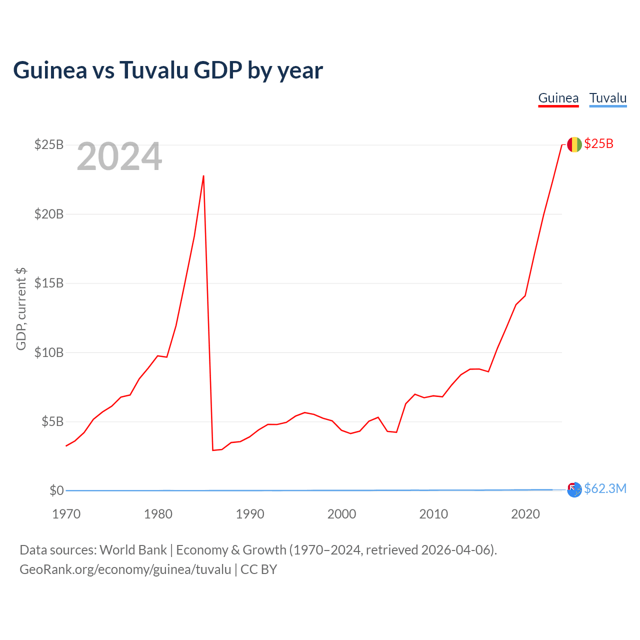 Guinea has a GDP of $25B compared to $62.3M for Tuvalu, ranking 118/197 and 196/197 by economy size, respectively.