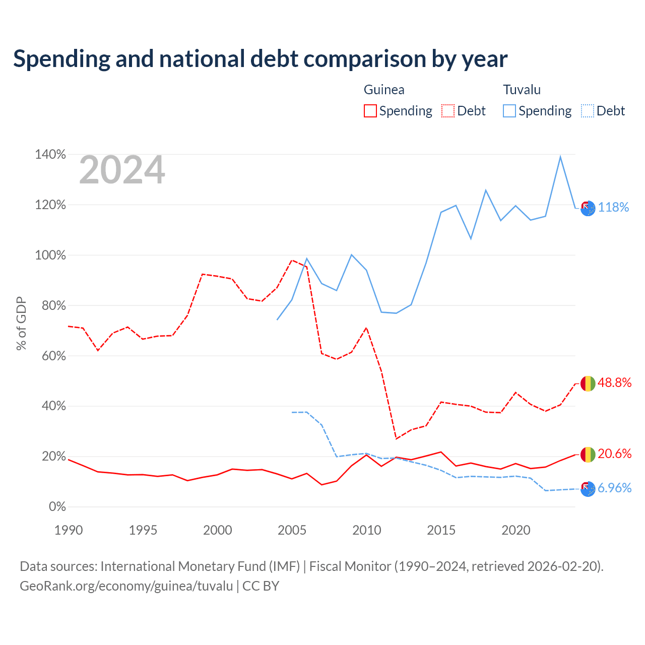 Guinea has $12.2B in government debt (48.8% of GDP), compared to $4.15M (6.96% of GDP) in Tuvalu.