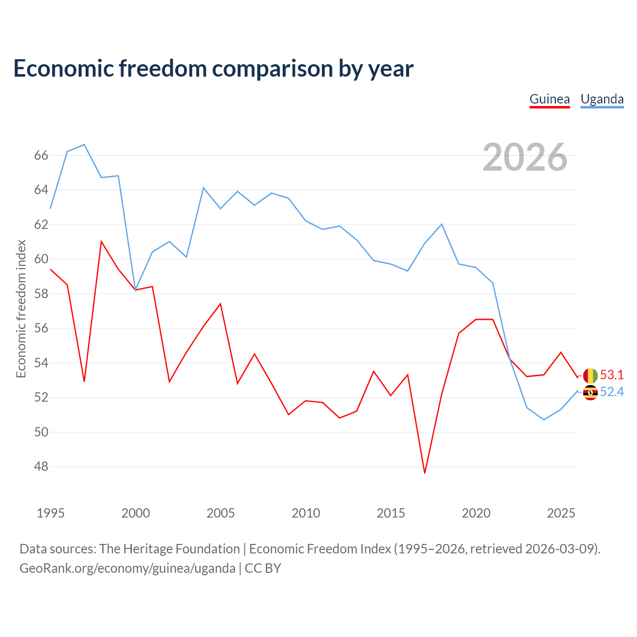 The Economic Freedom Index for Guinea is 53.1, ranking 141/197, compared to 52.4 for Uganda, ranking 149/197. The chart above displays a comparison of annual changes in economic freedom indexes.