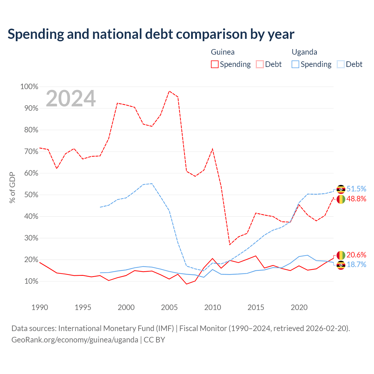 Guinea has $12.2B in government debt (48.8% of GDP), compared to $27.8B (51.5% of GDP) in Uganda.