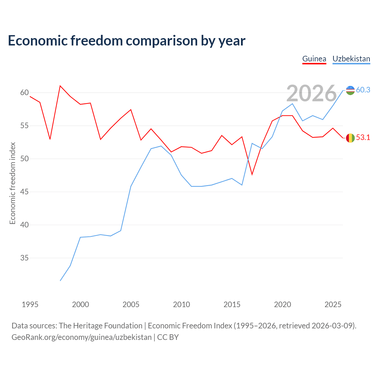 The Economic Freedom Index for Guinea is 53.1, ranking 141/197, compared to 60.3 for Uzbekistan, ranking 94/197. The chart above displays a comparison of annual changes in economic freedom indexes.