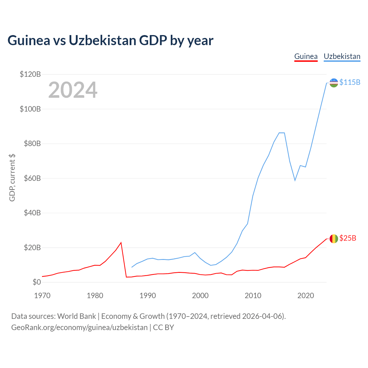 Guinea has a GDP of $25B compared to $115B for Uzbekistan, ranking 118/197 and 66/197 by economy size, respectively.