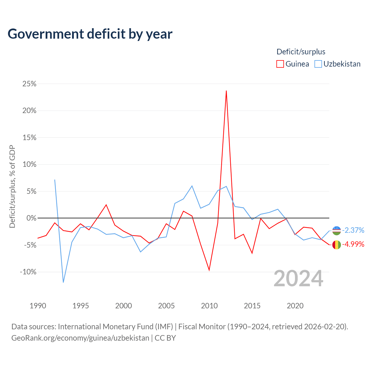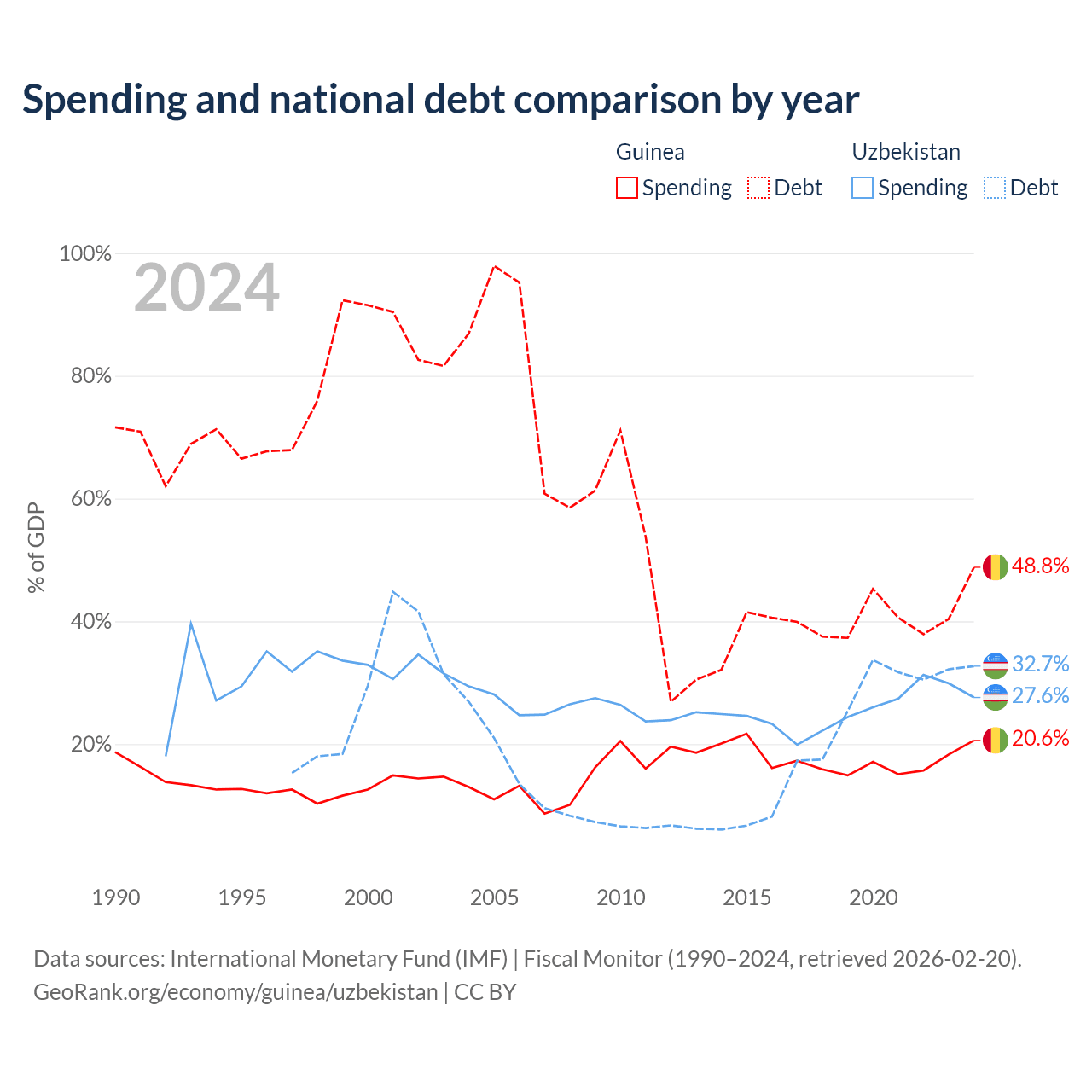 Guinea has $12.2B in government debt (48.8% of GDP), compared to $37.5B (32.7% of GDP) in Uzbekistan.