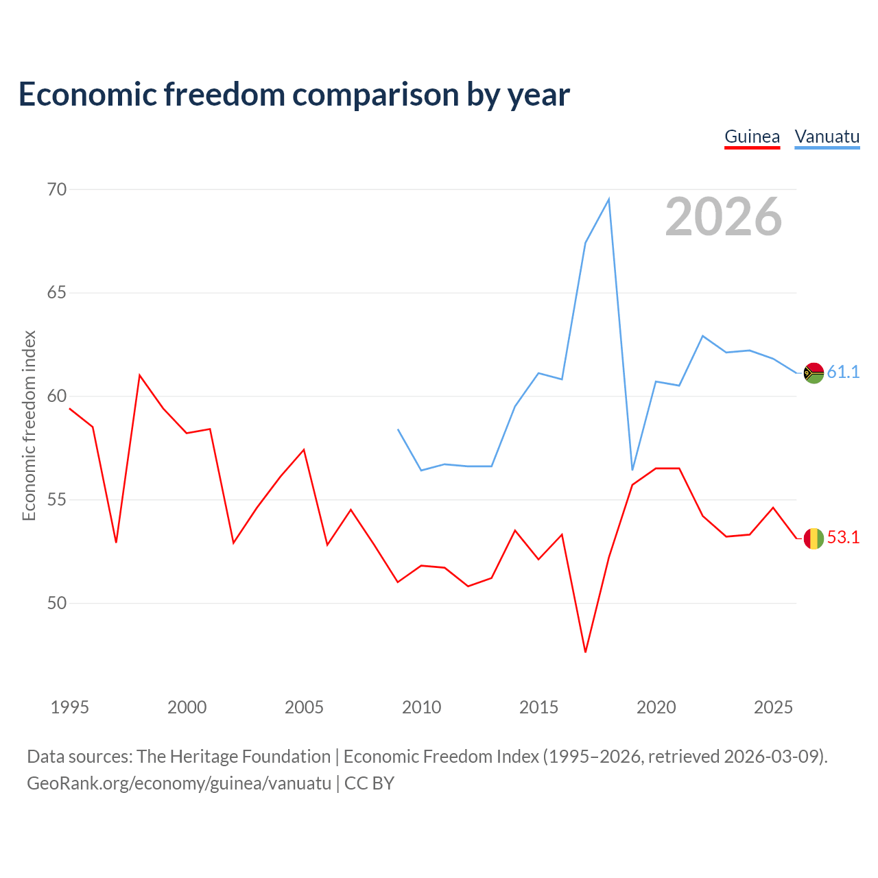The Economic Freedom Index for Guinea is 53.1, ranking 141/197, compared to 61.1 for Vanuatu, ranking 92/197. The chart above displays a comparison of annual changes in economic freedom indexes.