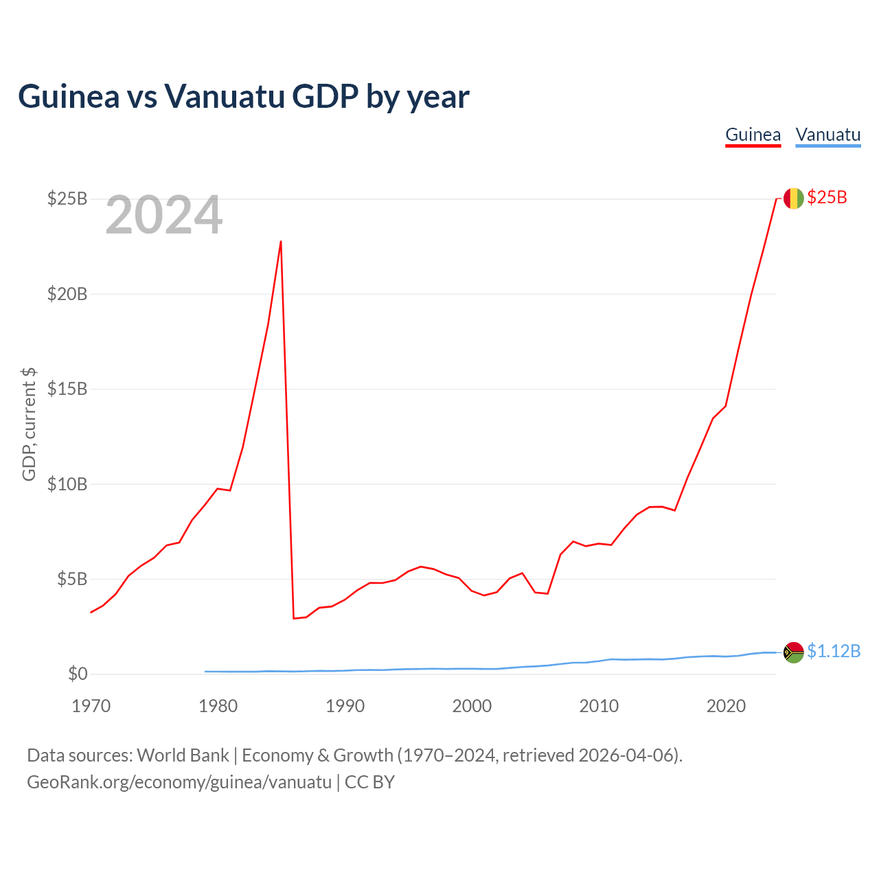 Guinea has a GDP of $25B compared to $1.12B for Vanuatu, ranking 118/197 and 188/197 by economy size, respectively.