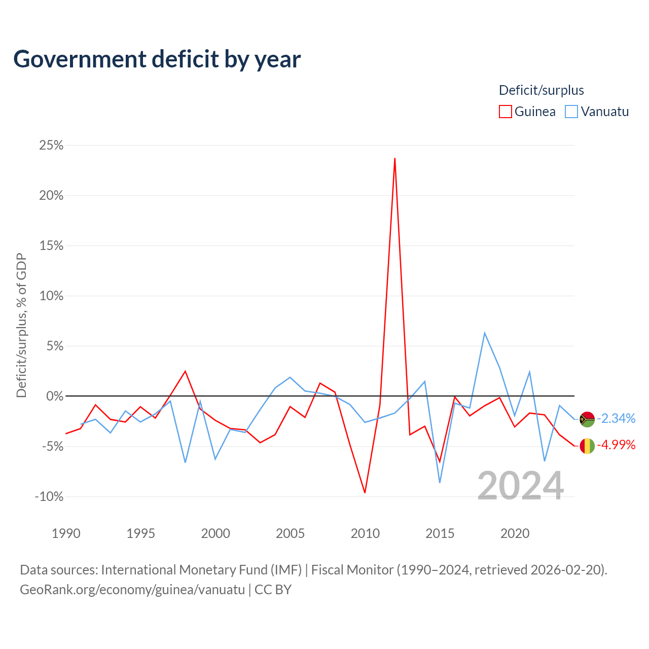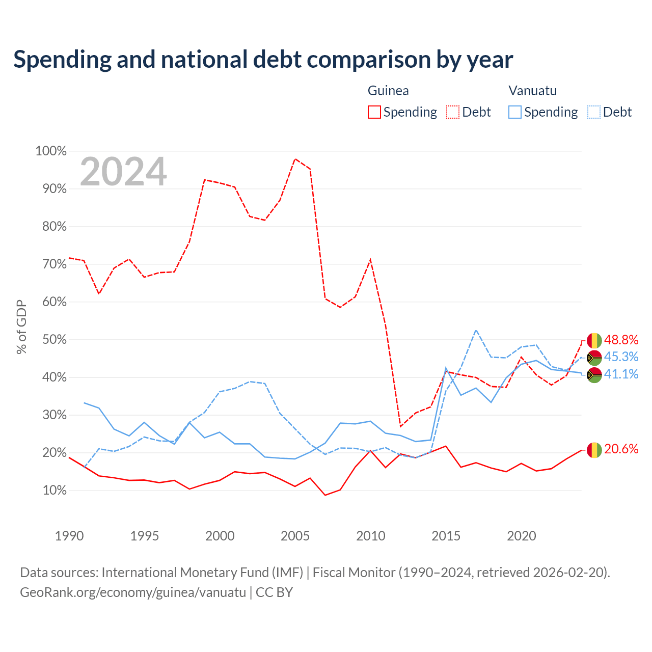 Guinea has $12.2B in government debt (48.8% of GDP), compared to $507M (45.3% of GDP) in Vanuatu.